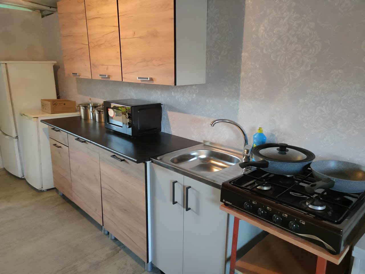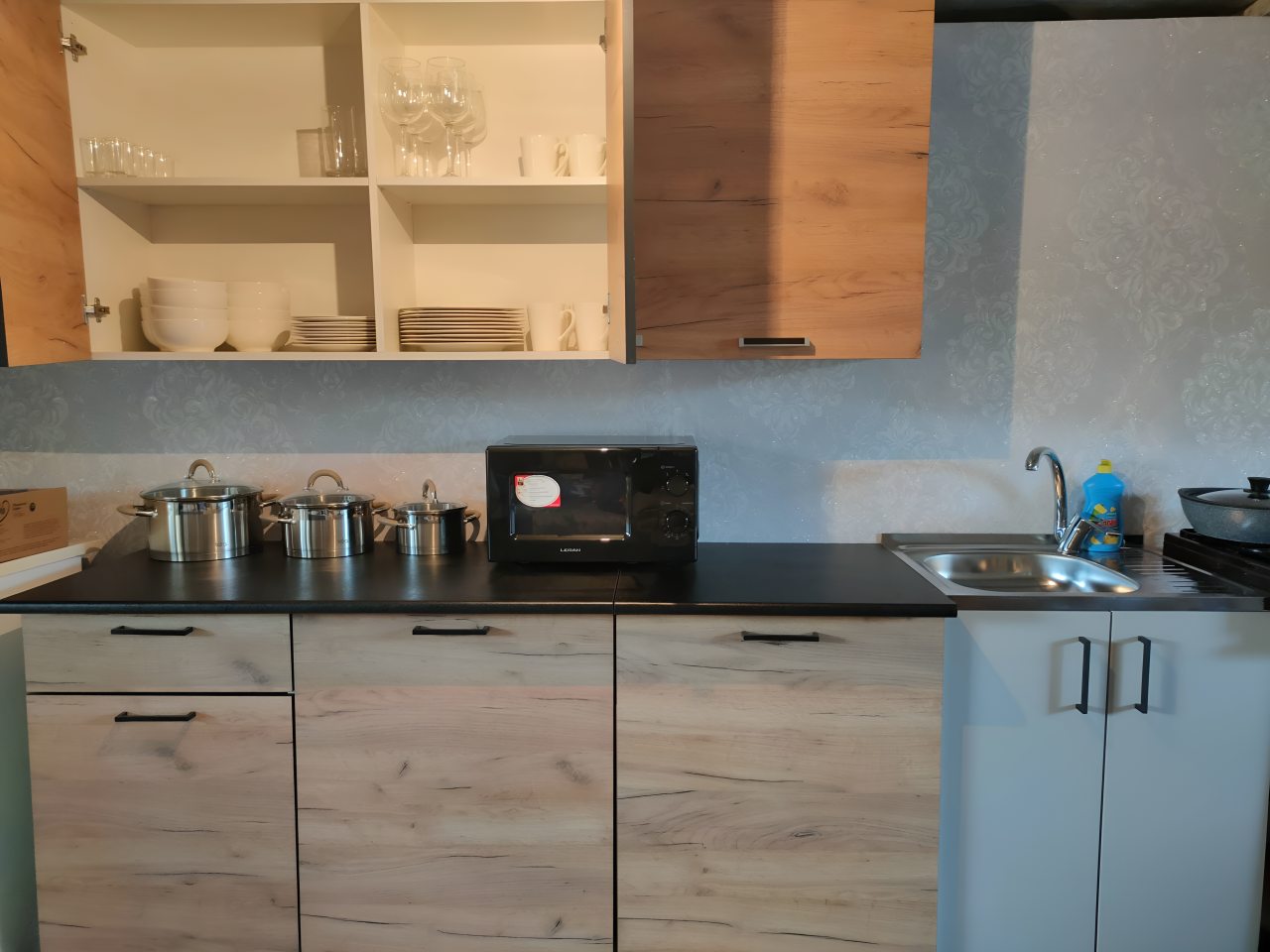 Общая кухонная зона оснащена необходимой посудой и техникой для организации питания: микроволновая печь, газовая плита, холодильник. В шаговой доступности есть кафе и продуктовый магазин.