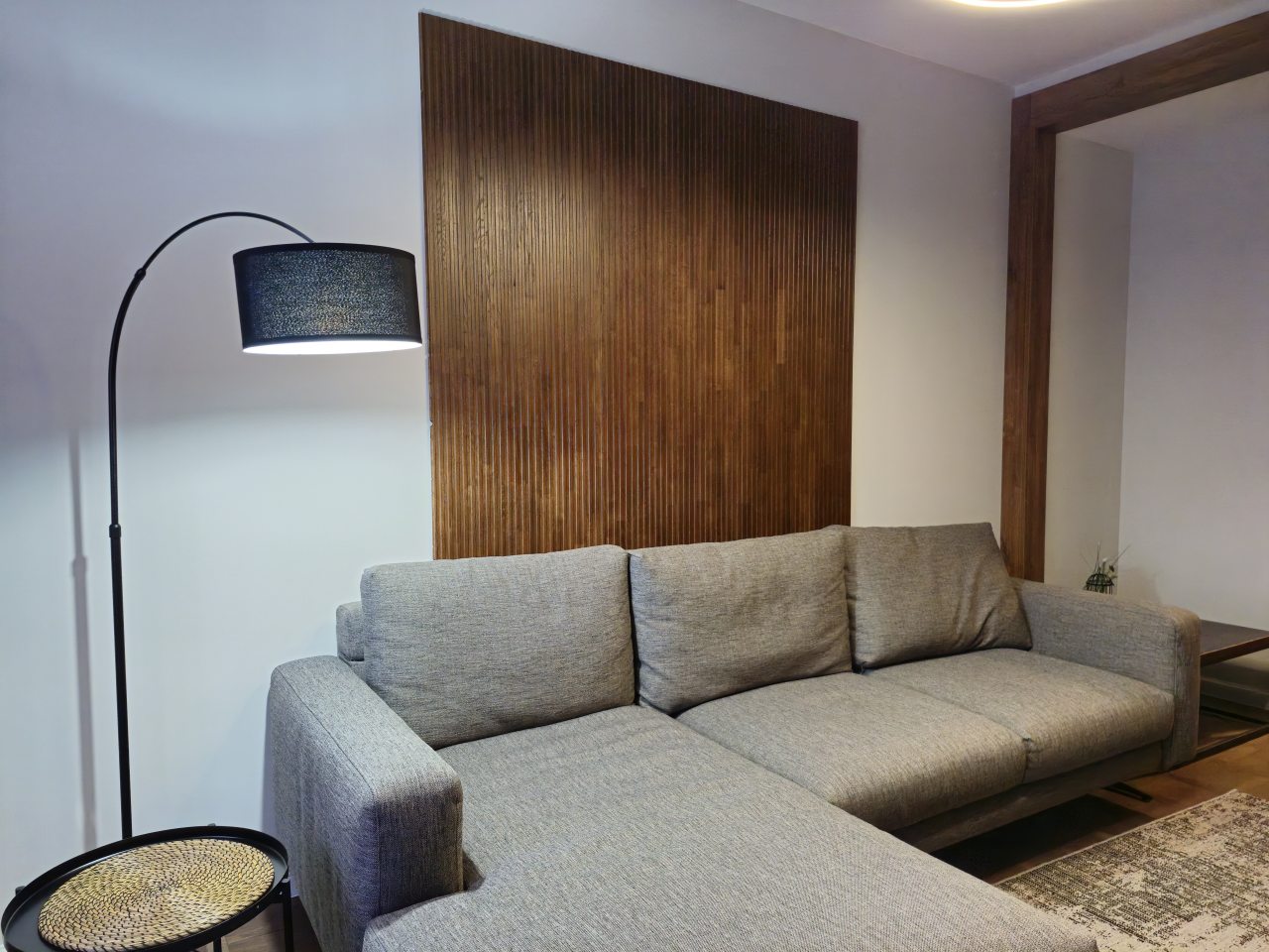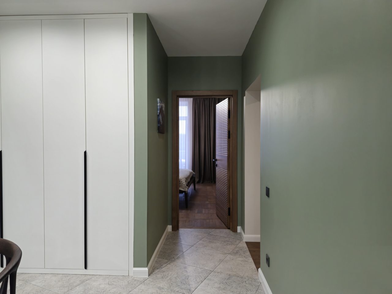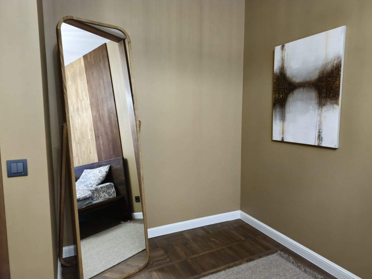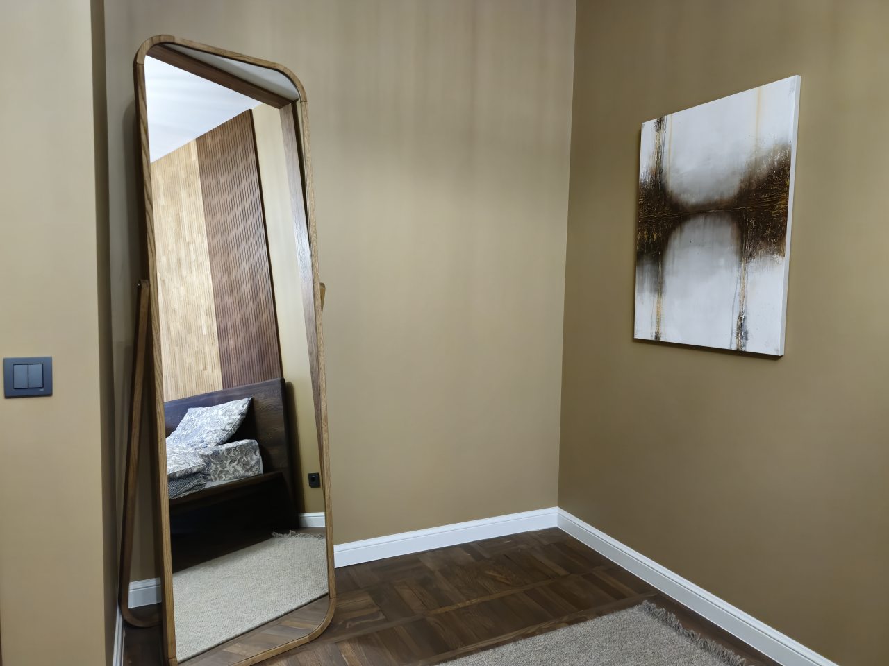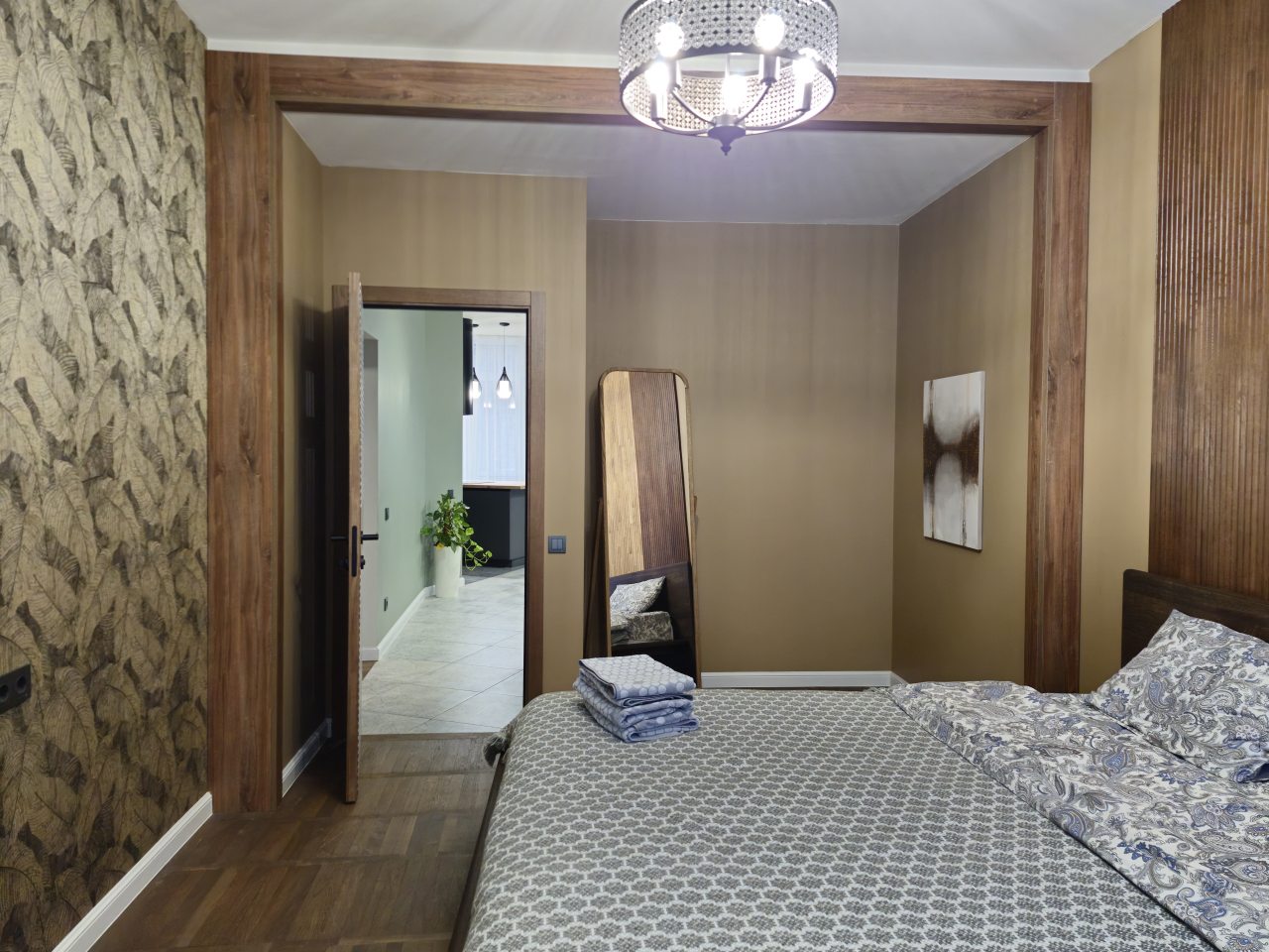 На площади в 70 квадратных метров вас ожидает стильный дизайн, большая и удобная кровать, мягкий и вместительный диван с телевизором, шкаф, санузел с необходимой сантехникой, разноплановое освещение.