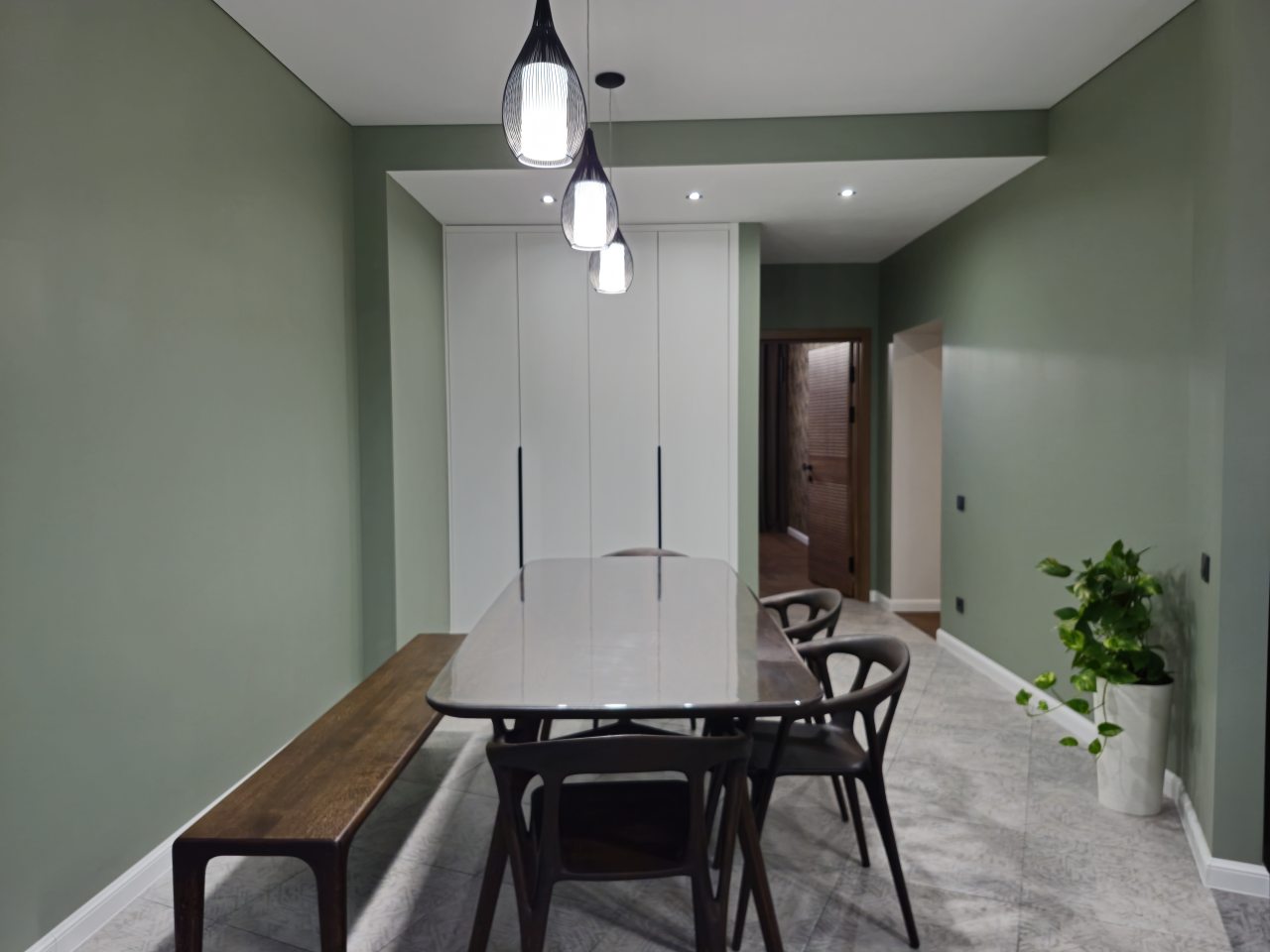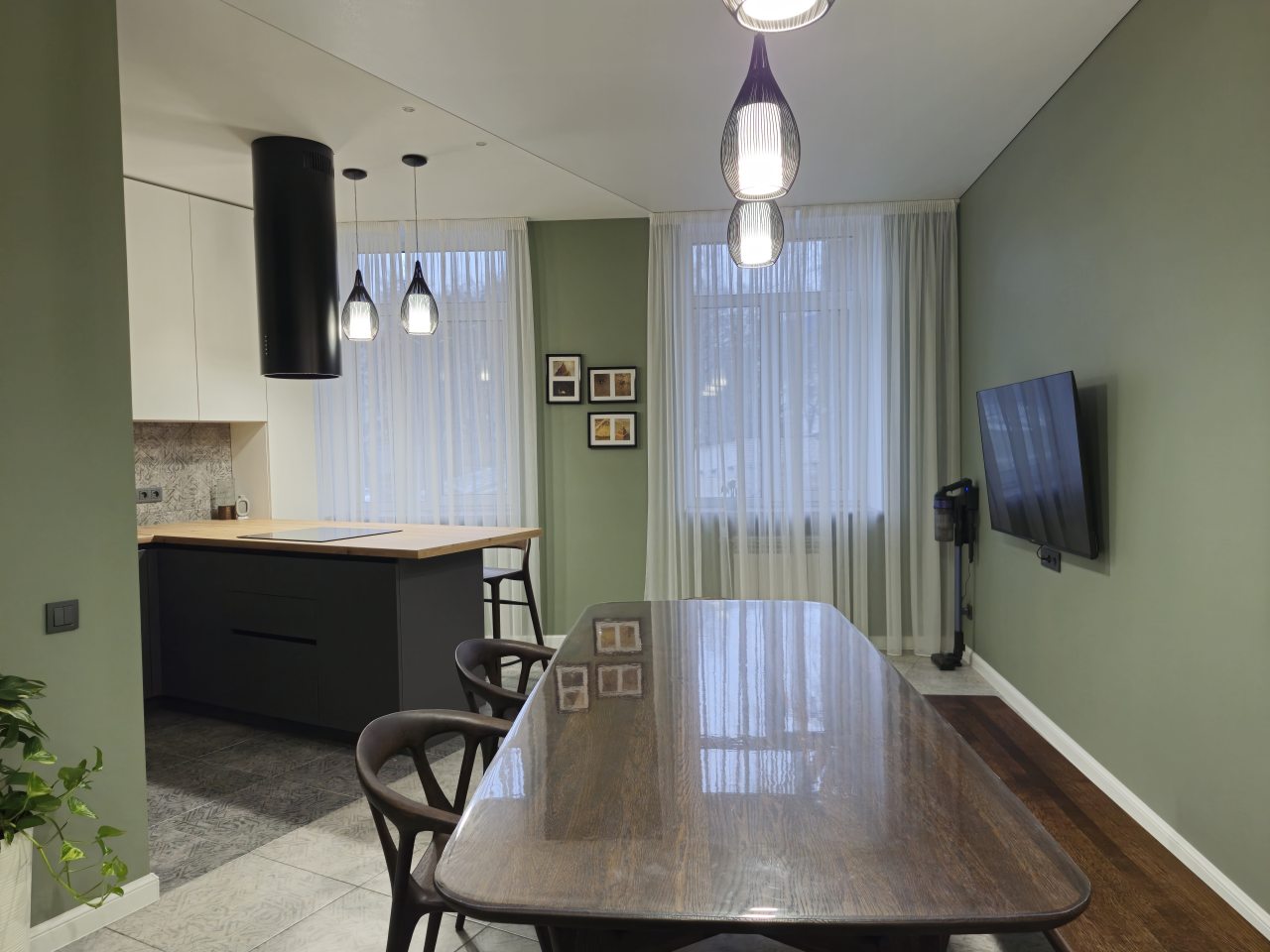 Современная кухня вдохновит вас на приготовление любимых напитков и блюд. В наличии — плита с вытяжкой, чайник, СВЧ, духовой шкаф, красивая обеденная зона.