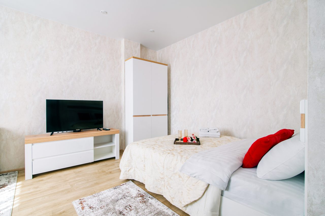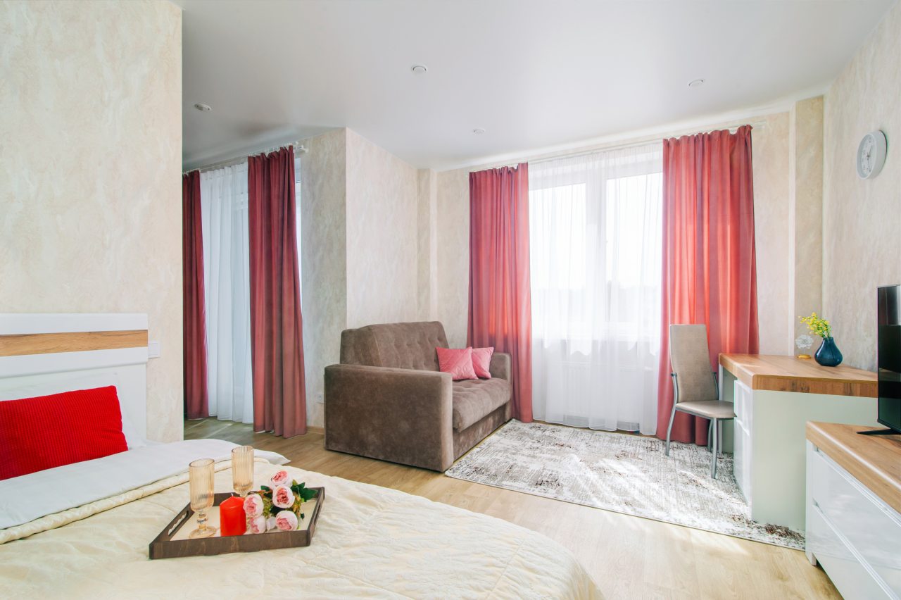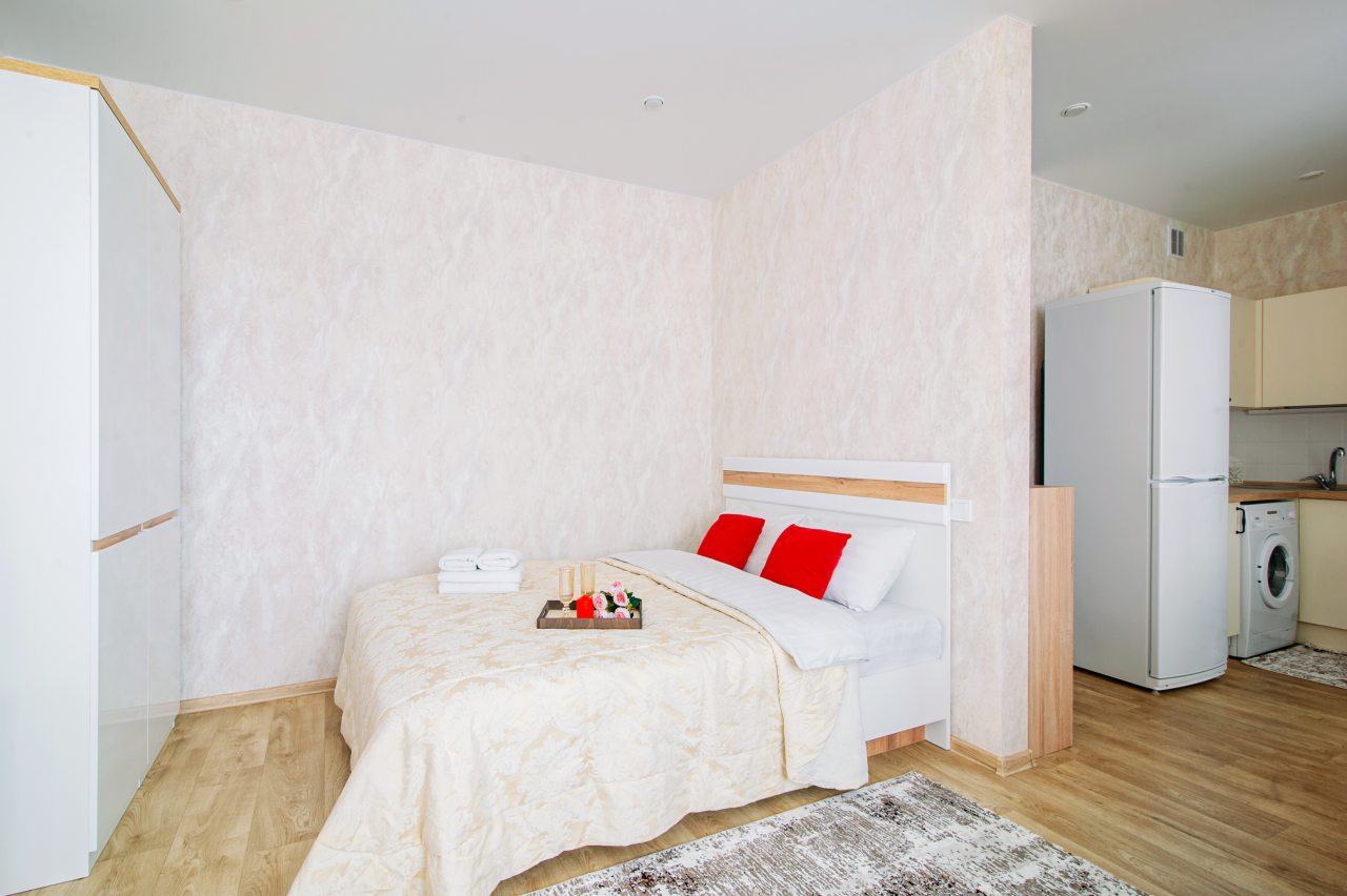 К проживанию предлагается однокомнатная квартира с двуспальной кроватью, вместительным шкафом, диваном, пуфиком, креслом, вентилятором. Вечером можно расслабиться и посмотреть телевизор. Быть на связи поможет скоростной интернет. Санузел оснащён сантехникой, стиральной машиной, феном, набором полотенец, средствами гигиены.