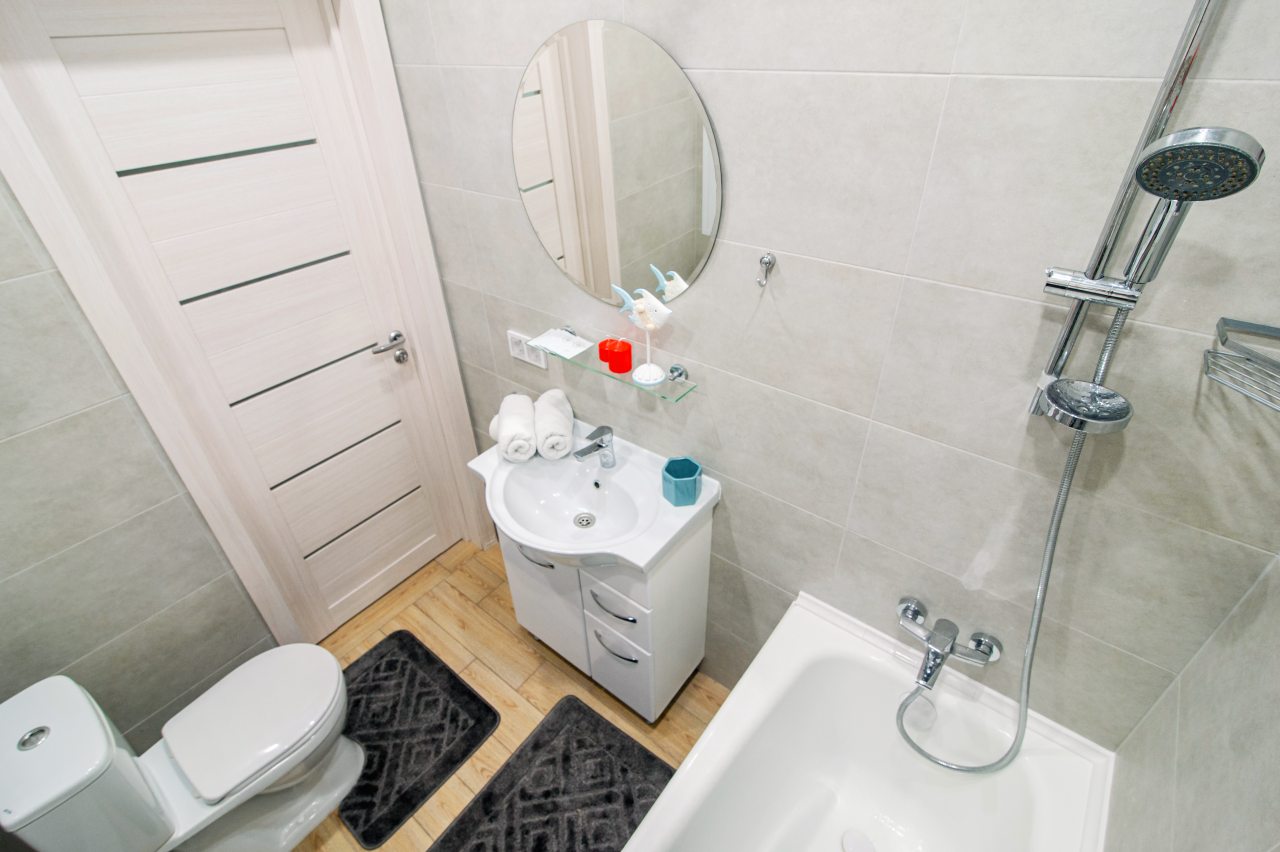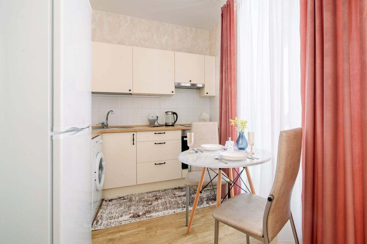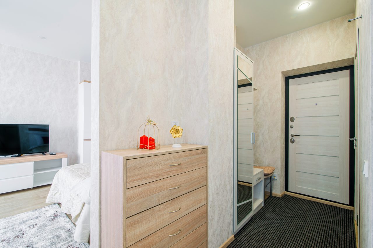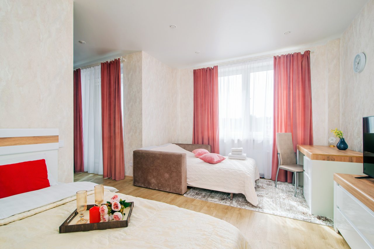 К проживанию предлагается однокомнатная квартира с двуспальной кроватью, вместительным шкафом, диваном, пуфиком, креслом, вентилятором. Вечером можно расслабиться и посмотреть телевизор. Быть на связи поможет скоростной интернет. Санузел оснащён сантехникой, стиральной машиной, феном, набором полотенец, средствами гигиены.