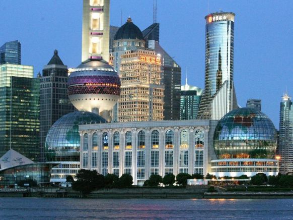 Отель Pudong Shangri-La, East Shanghai с видом на набережную Вайтань и реку Хуанпу занимает 2 высотных здания в финансовом районе Луцзяцзуй.
