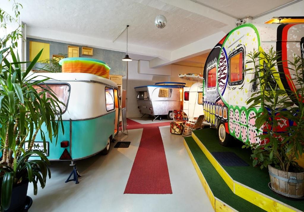 Дома на колесах и коттеджи расположены в крытом кемпинге внутри одного из 2 цехов бывшей фабрики.