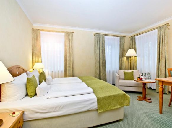 В ресторане подают блюда немецкой кухни, а рядом с открытым сезонным бассейном расположился пивной сад.