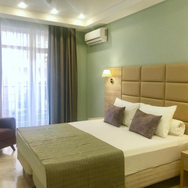 Отдыхали в середине сентября. Современный отель. Девушки на ресепшене Римма и Елена, очень приветливые, всё чётко внятно объяснили. Наличие лифта! Широкое, просторное пространство перед входом в номер. Высокие перила, закрытые, для безопасности детей. По номеру: чисто, все блестит, убираются каждый день. Шампуни, туалетную бумагу пополняют. Душевая кабина восторг! С хорошим напором. Посуда, кастрюли,стаканы, турка! Бельё меняют по средам. Бельё тоже чистое, приятное, ни чем не пахнет. Кровати удобные. Нас было 3, поэтому на кухне нам разложили диван. Тоже очень удобный, ещё подстелили матрац. Выдали полотенца под залог для бассейна и моря, меняй хоть каждый час. Бассейн хороший, пахнет хлоркой, что для меня признак чистоты. На счёт расстояния до моря: если выходя из отеля завернуть налево, до моря 3 минуты. Направо чуть больше, 7-10. Набережная хорошая, с мелкой и средней галькой. На счёт шума самолётов: 1000 раз не пожалела, что выбрали этот отель. Если пройти вдоль набережной, в сторону Южного взморья-будет ужасно шумно. Там даже гулять не возможно, не то что спать. Подробнее