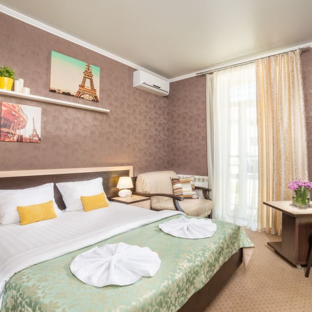 Чистый номер, кондиционер, телевизор, холодильник. Питание хорошее, шведский стол. Море рядом. Магазины 10 мин продуктовый , остальные 15- 25 мин и автовокзал. Подробнее
