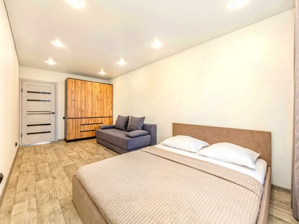 Внутри продумана каждая деталь, чтобы каждый гость смог почувствовать атмосферу уюта и комфорта. В наличии: кровать с мягким изголовьем и качественным матрасом, различные сценарии освещения, вместительный шкаф, стиральная машина, гостиная с диваном, телевизором и кондиционером.