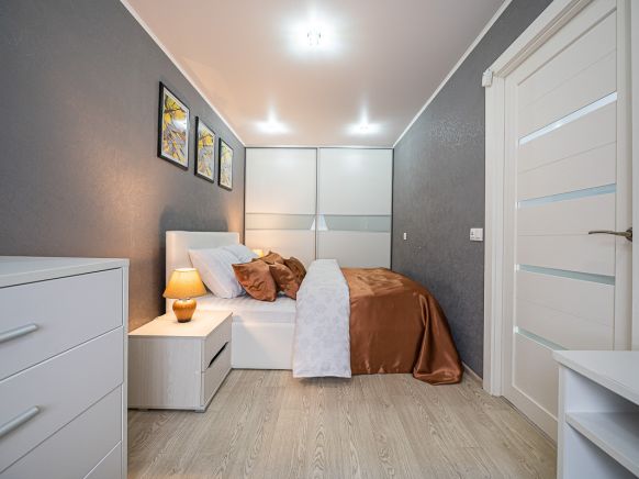 Внутри есть всё для вашего удобства, в том числе двуспальная кровать с качественным матрасом, вместительный шкаф с зеркалом, удобный и мягкий диван, телевизор, а также ванная комната, укомплектованная стиральной машиной и полотенцами.