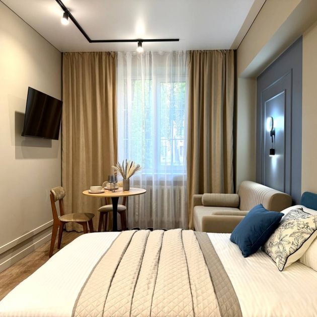 Апартаменты достаточно просторные. Мебель новая, и в целом атмосфера уютная. Особенно понравилось наличие кухни, на которой легко приготовить еду, если не хочется выходить. Ванная комната чистая, с хорошим сантехническим оборудованием. Всё сделано с заботой о комфортных условиях для гостей. Подробнее