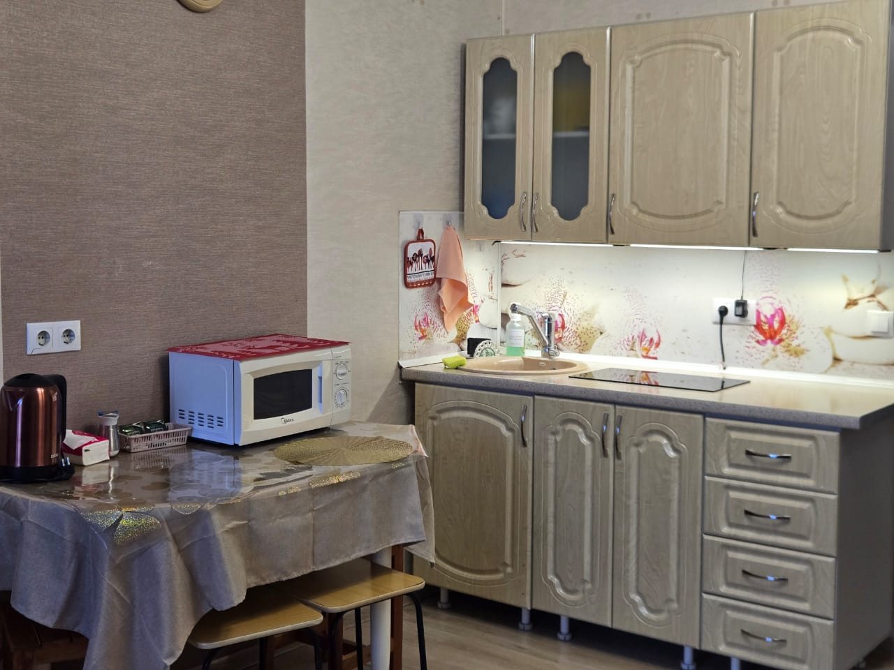 Кухня оснащена обеденной зоной и бытовой техникой для организации питания: микроволновая печь, варочная панель, электрический чайник. В шаговой доступности находится кафе и сеть быстрого питания, где можно вкусно пообедать.
