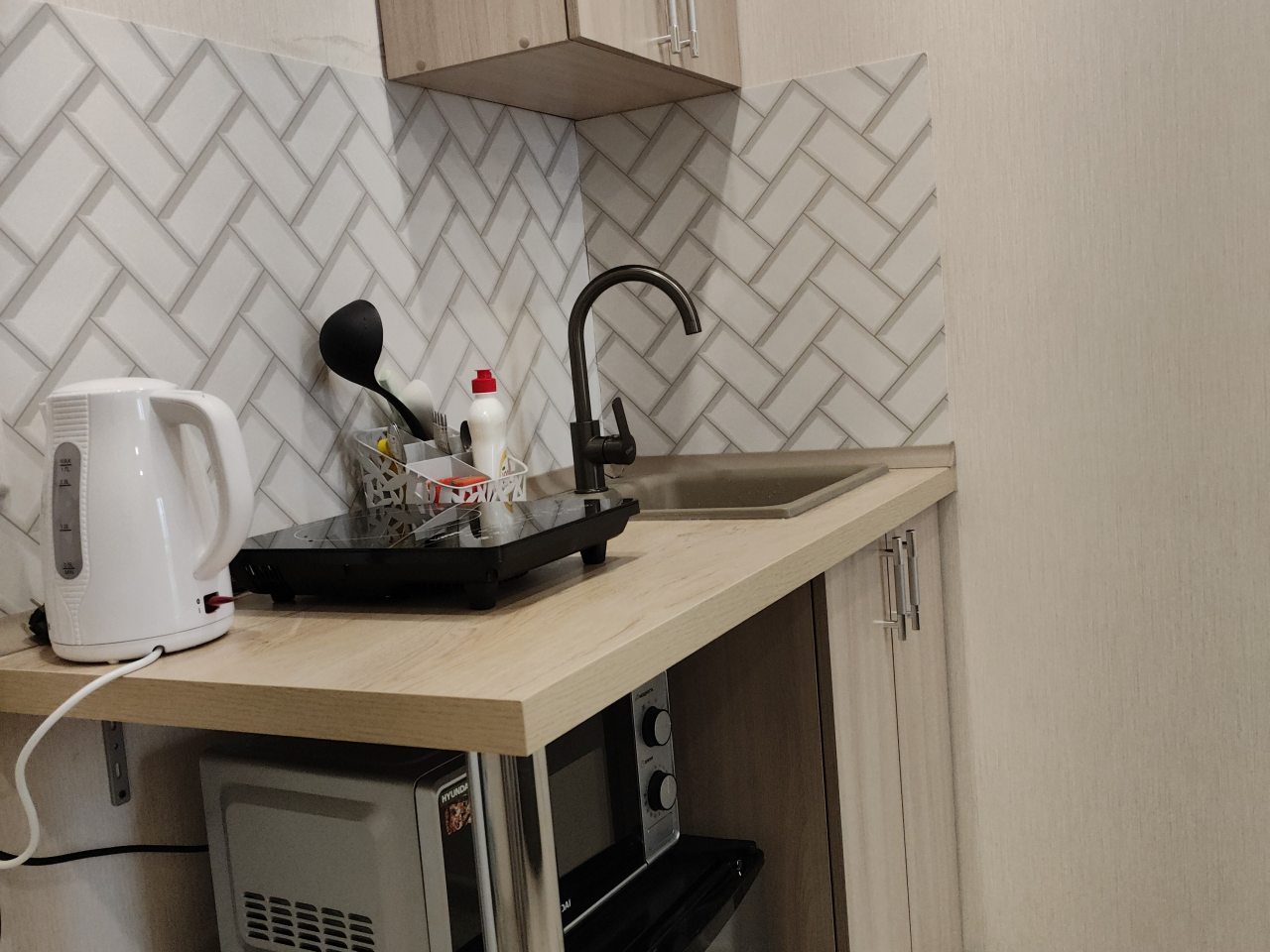 Кухонная зона укомплектована электроплитой, чайником, холодильником, микроволновой печью и посудой. Пообедать можно в ближайшем кафе.