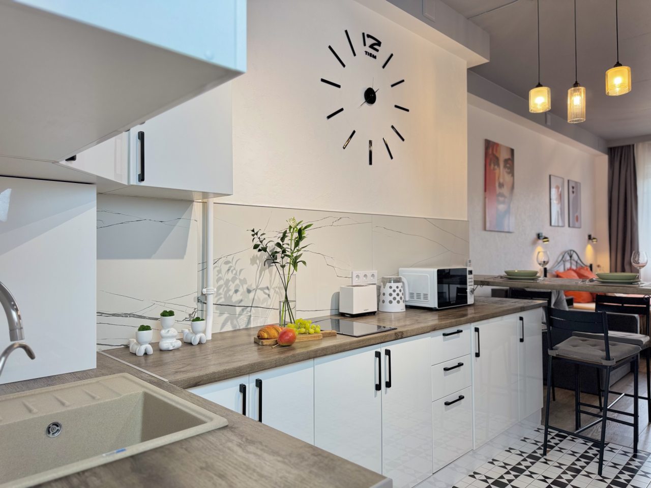 Просторная кухонная зона укомплектована микроволновой печью, электрочайником, варочной панелью. Пообедать можно в ближайшем кафе. В доступности продуктовые магазины.