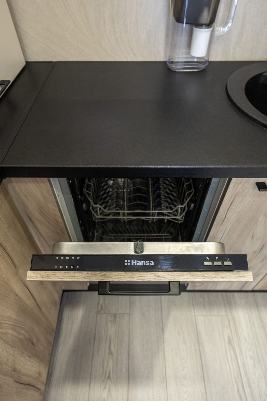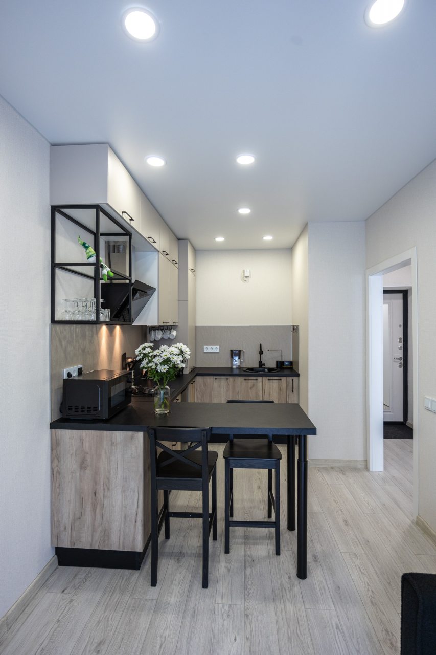 Компактная кухня оснащена всем необходимым для комфортного приготовления напитков и блюд, в том числе плитой с вытяжкой, посудой, СВЧ, чайником, холодильником.