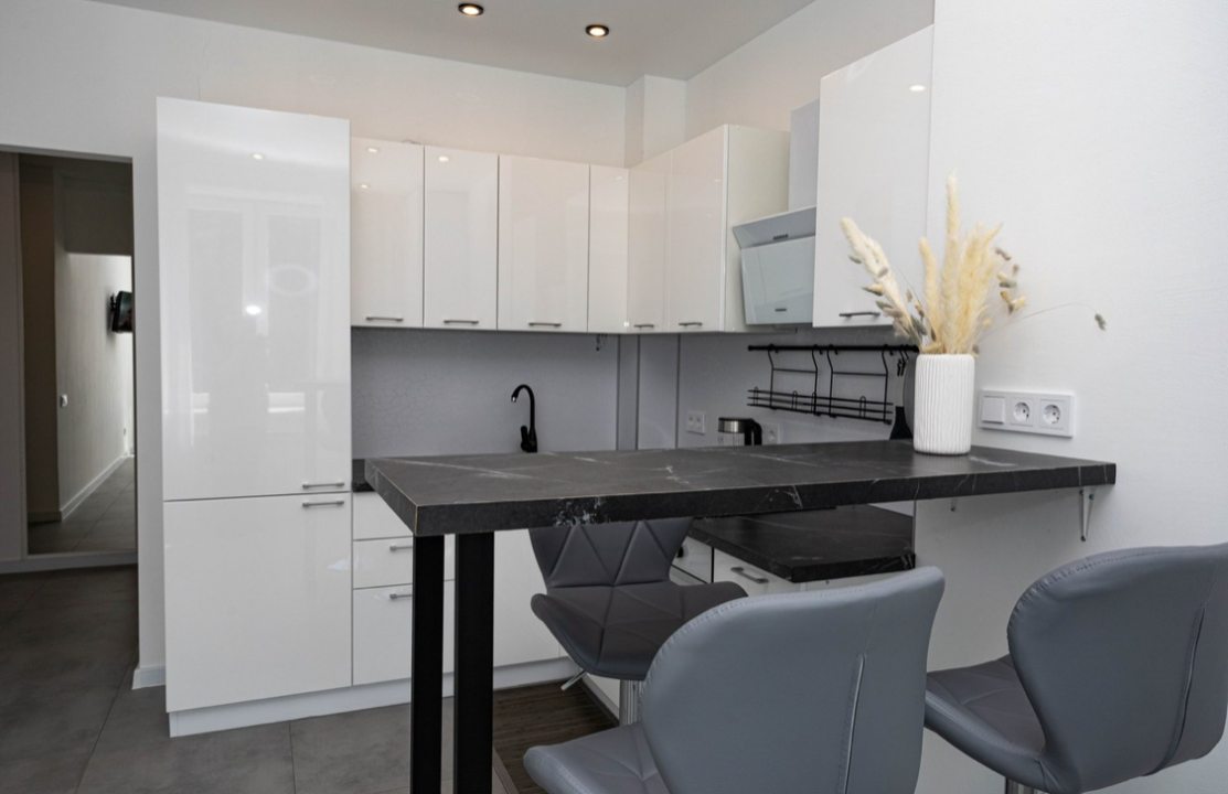 Кухня полностью укомплектована. В наличии плита, духовой шкаф, посуда, посудомоечная машина, чайник, обеденный стол и стулья. Таким образом, вы всегда сможете порадовать себя приготовлением любимых напитков и блюд.