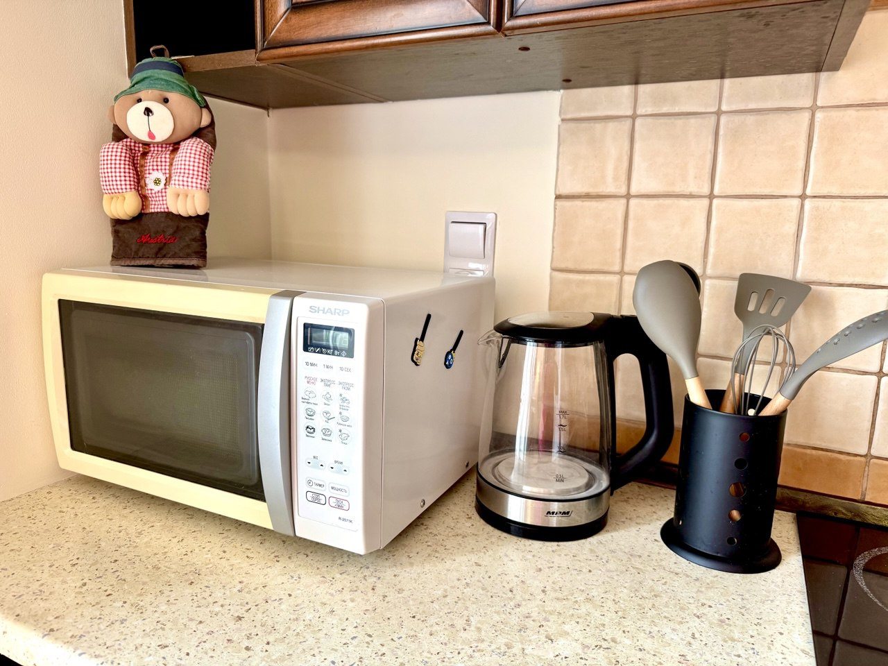 Кухня полностью укомплектована: предусмотрены чайник, плита с вытяжкой, СВЧ, духовой шкаф, посуда.