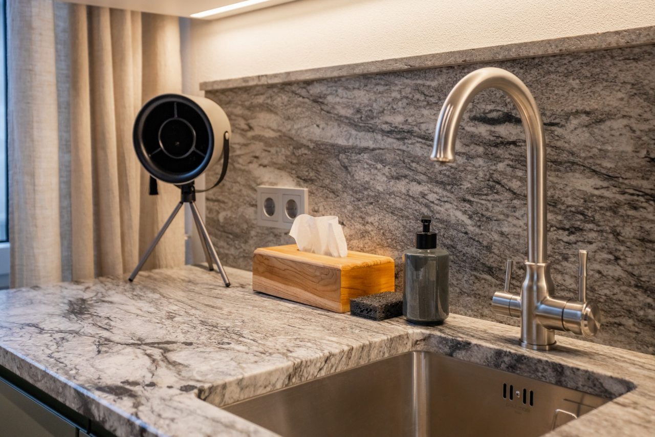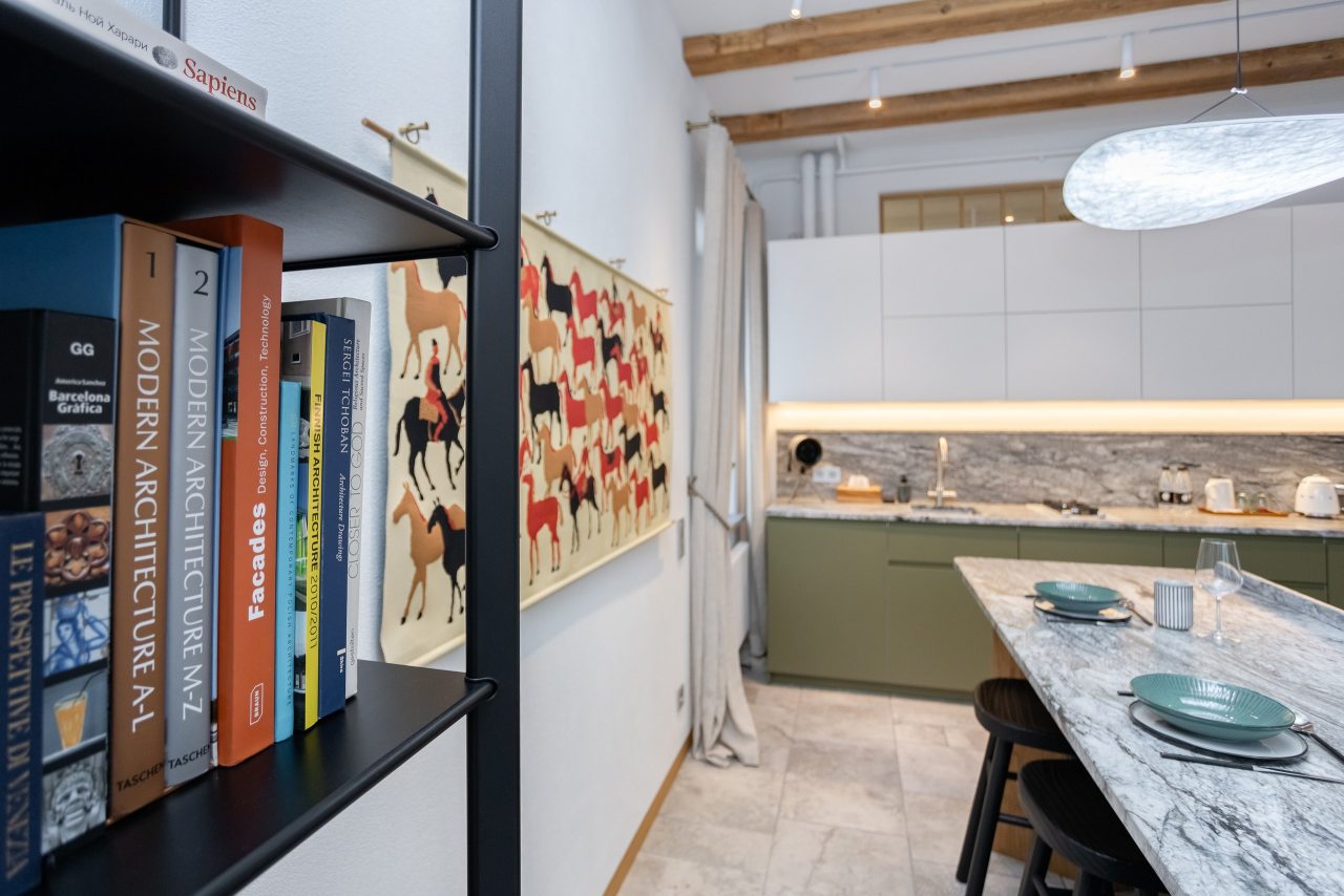 Зона кухни оснащена плитой, чайником, кофемашиной, посудой, красивым обеденным столом и стульями.