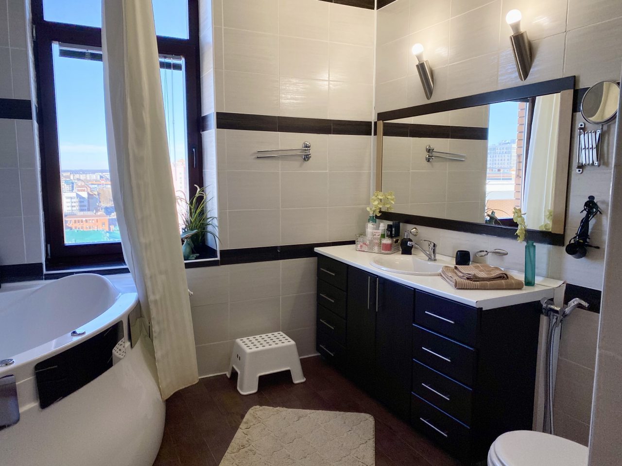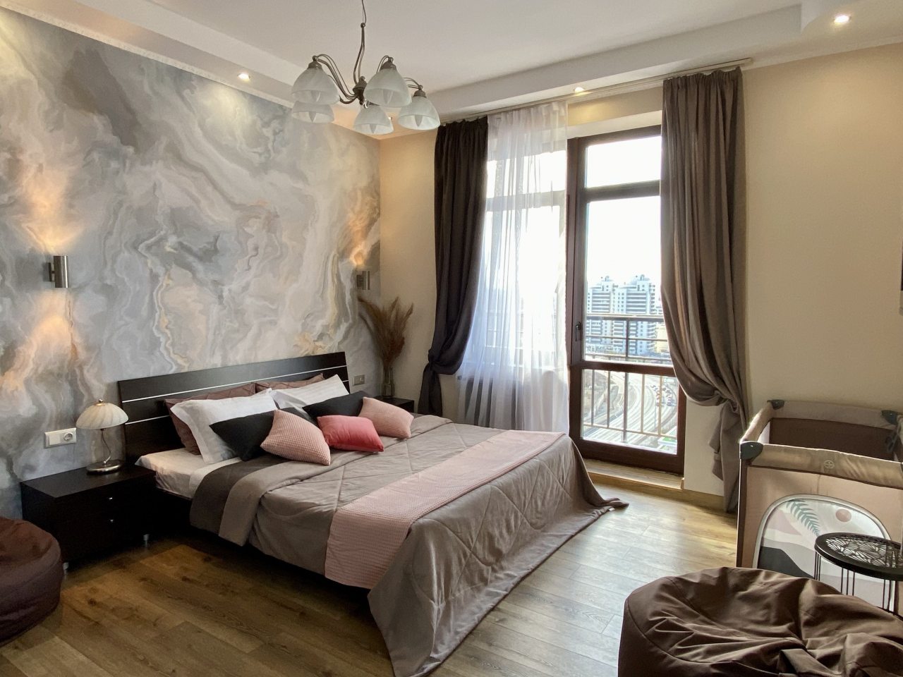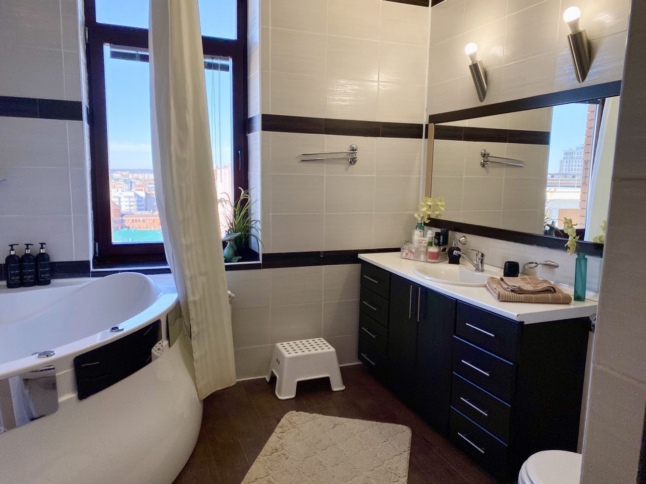 Апартаменты со стильным и необычным дизайном обустроены удобной мебелью и техникой: гостиная с большим диваном и телевизором, спальня с двуспальной кроватью, просторная ванная комната с джакузи, стиральная машина, Wi-Fi, панорамные окна с красивым видом.