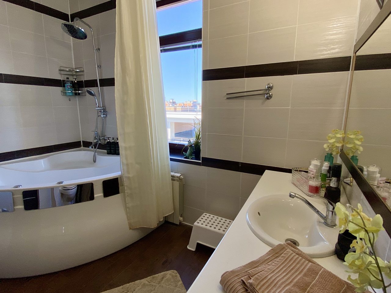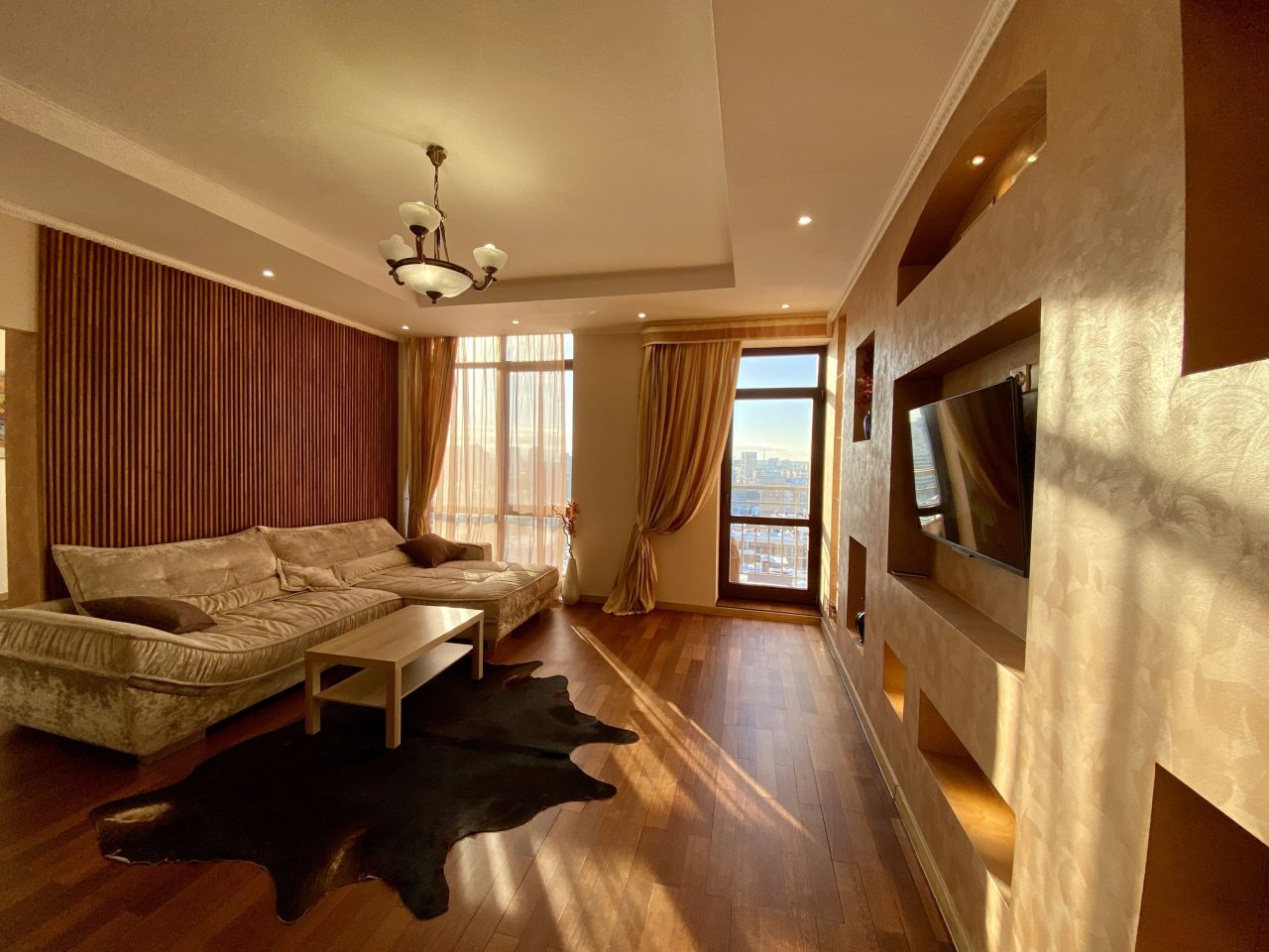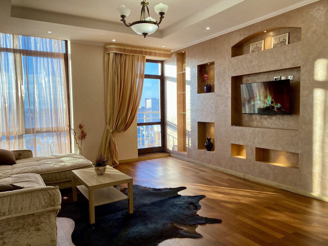 Апартаменты со стильным и необычным дизайном обустроены удобной мебелью и техникой: гостиная с большим диваном и телевизором, спальня с двуспальной кроватью, просторная ванная комната с джакузи, стиральная машина, Wi-Fi, панорамные окна с красивым видом.