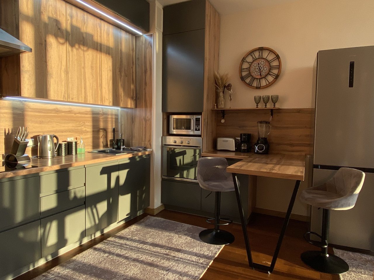 На кухне установлена необходимая бытовая техника, имеется посуда и столовые приборы. В округе работает множество разнообразных ресторанов и кафе.