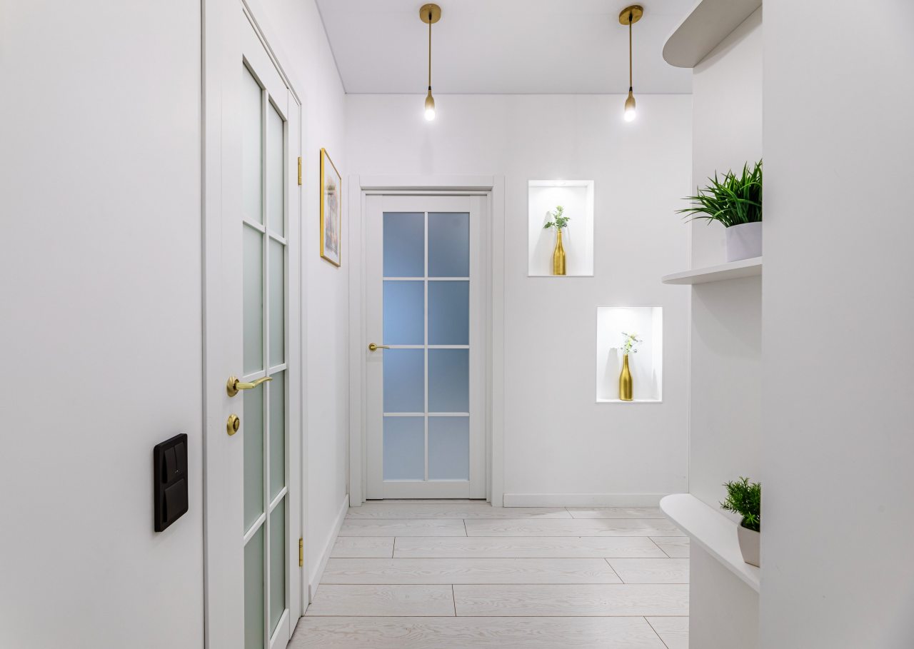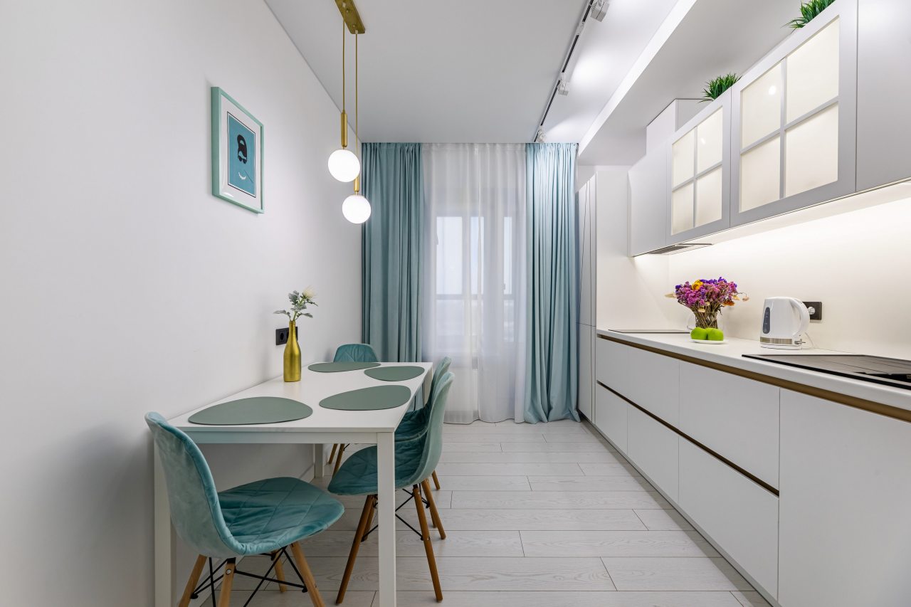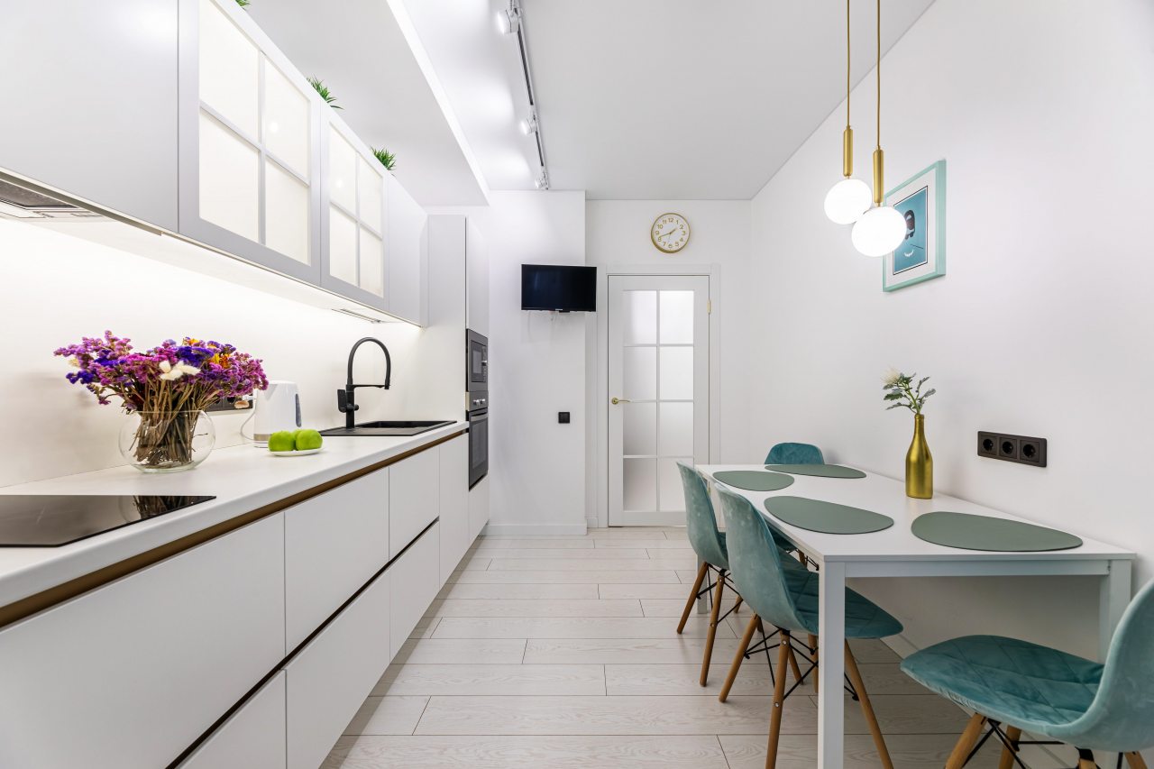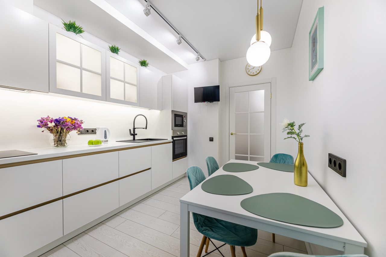 Просторная кухня оснащена белоснежным гарнитуром, варочной панелью, микроволновой печью