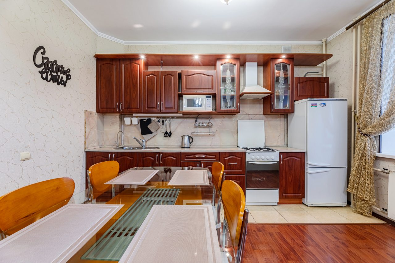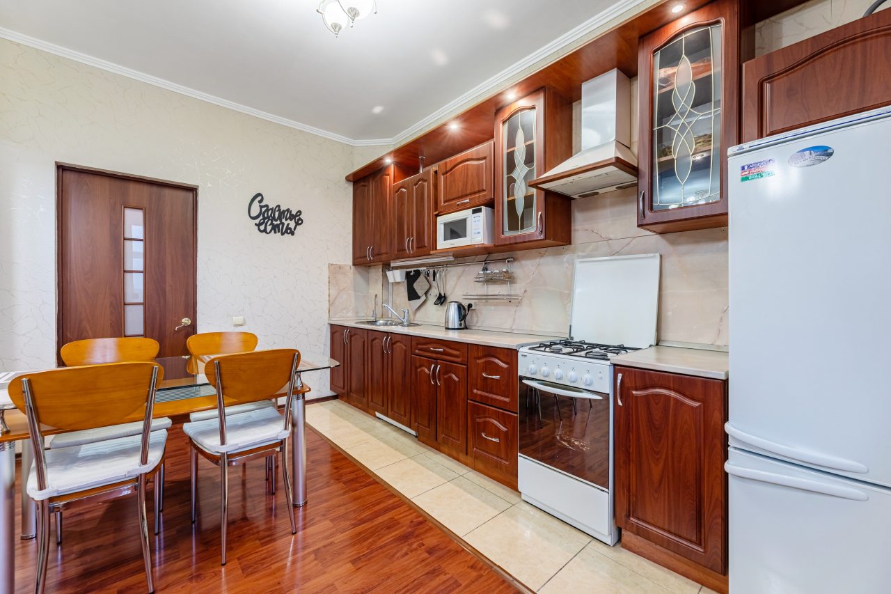 На кухне вы сможете воплотить в жизнь любую кулинарную задумку, так как в наличии духовой шкаф, плита с вытяжкой, СВЧ, холодильник, чайник.