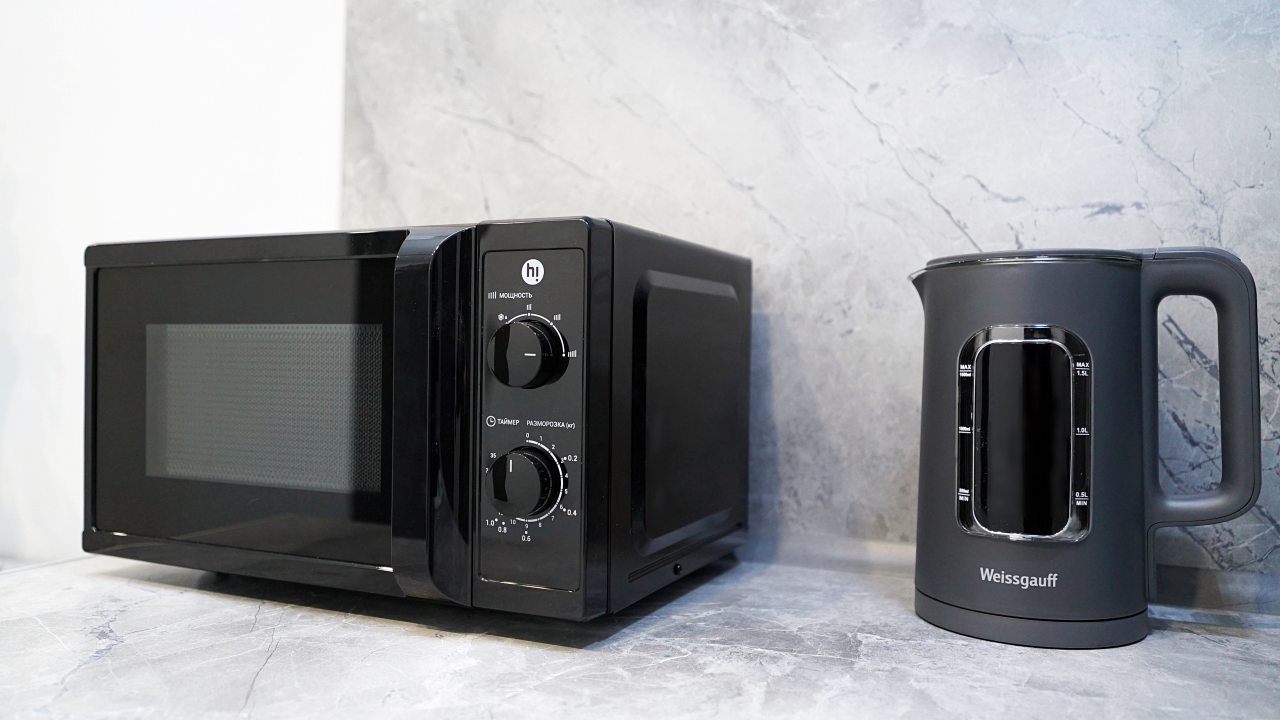 Зона кухни укомплектована СВЧ, чайником, необходимой посудой, холодильником, обеденным столом и стульями.