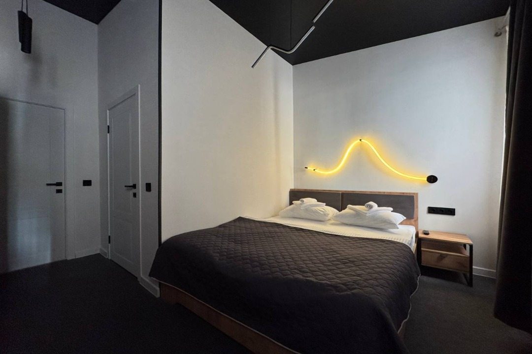 Для выбора доступны различные по вместимости номера, в каждом — всё самое необходимое для отдыха и проживания, включая удобные кровати, плотные шторы, телевизор, шкаф, кондиционер, подсветку и собственный санузел.