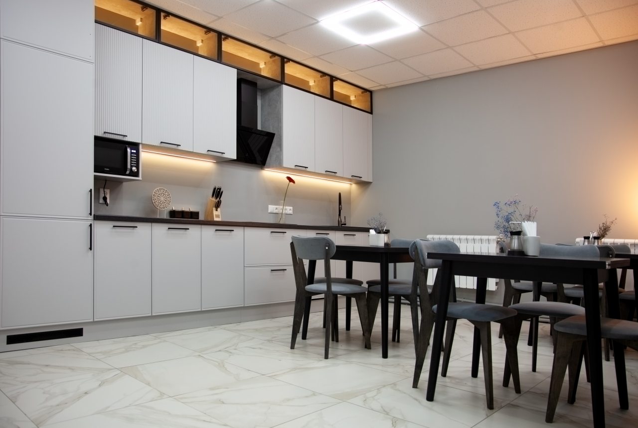 Готовить любимые блюда можно на общей кухне с плитой, холодильником, СВЧ, обеденными столами и стульями.