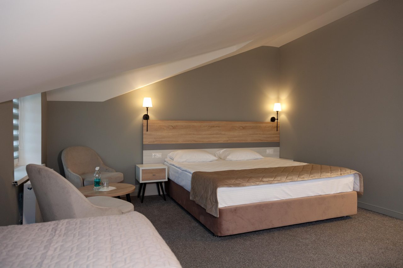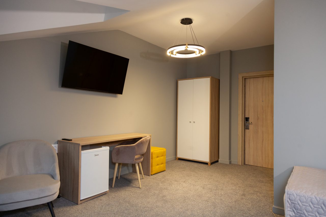 Для проживания предлагаются уютные номера, которые оснащены современной мебелью и техникой, в том числе удобными кроватями, шкафами, телевизорами. Санузел укомплектован раковиной, душем, туалетом.