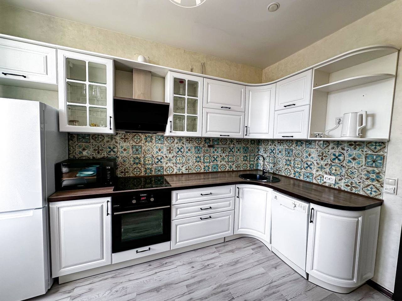 Просторная кухня оборудована белоснежным гарнитуром, обеденным столом, электроплитой, вытяжкой, микроволновой печью, духовым шкафом и холодильником. Пообедать можно в ближайшем кафе.