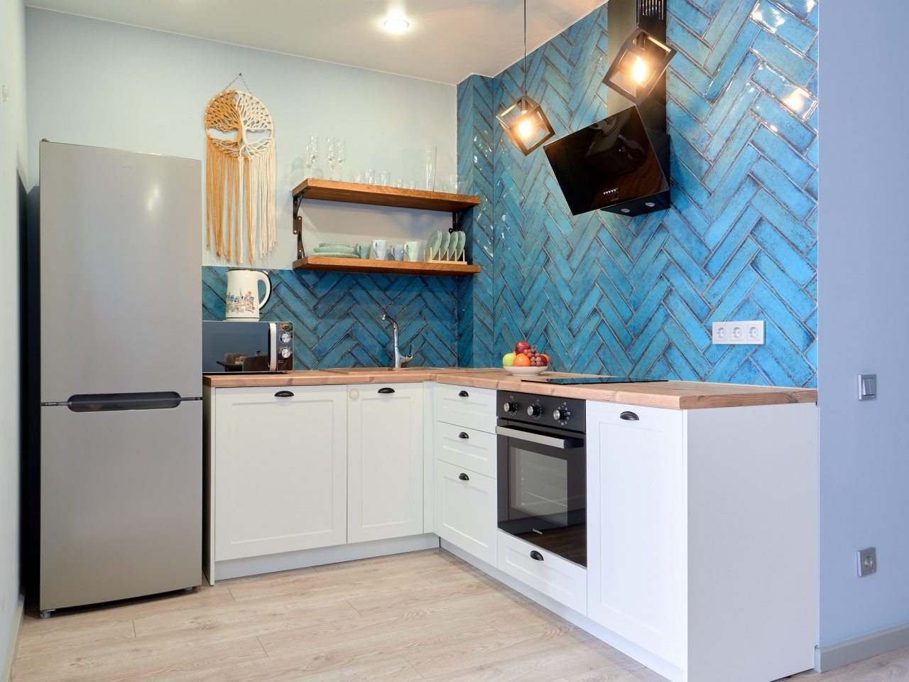 Кухня оборудована электрочайником, микроволновой печью, варочной панелью, духовым шкафом, вытяжкой, холодильником и набором посуды. В доступности кондитерская, продуктовый магазин и кафе.