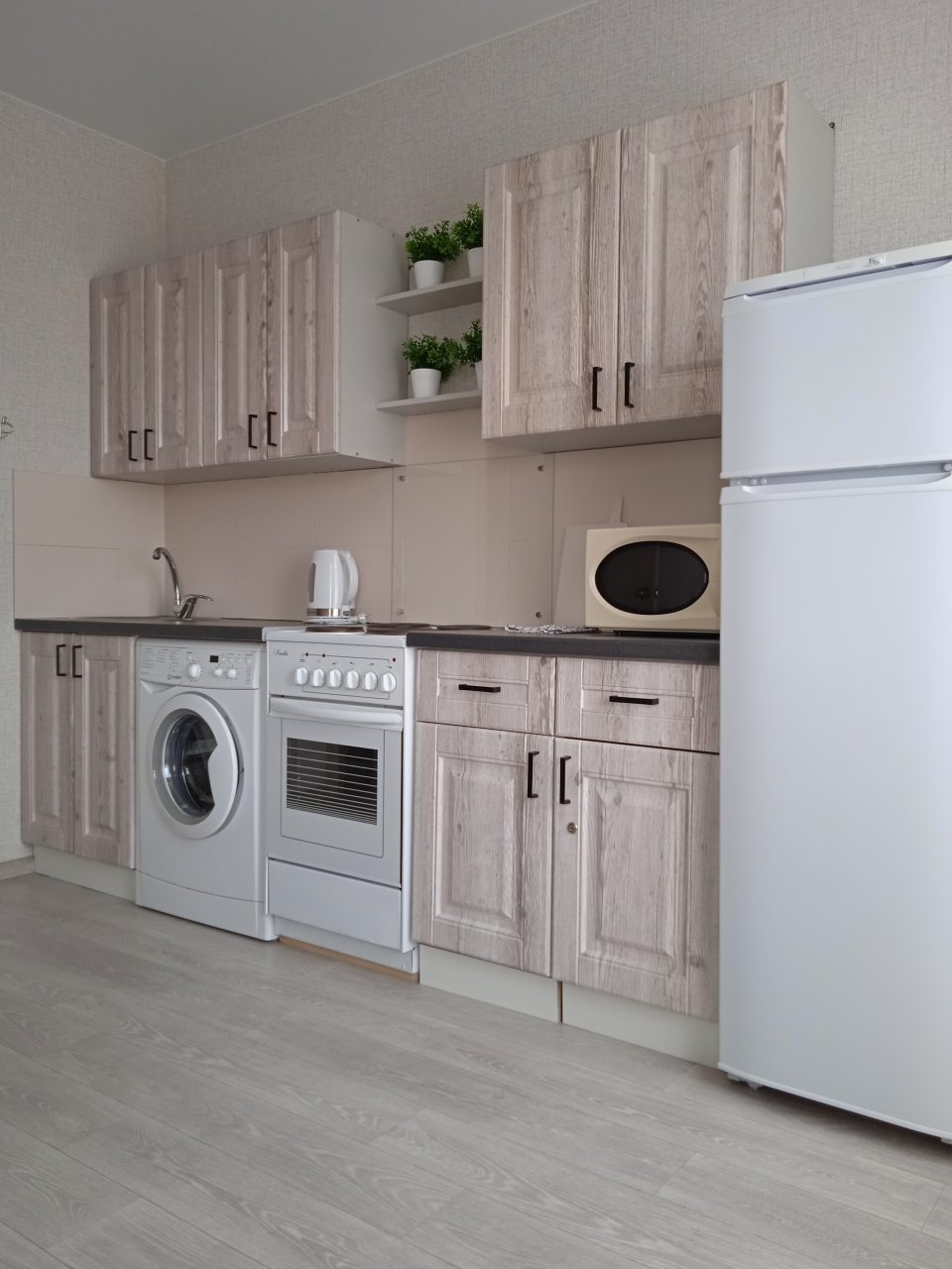 На просторной кухне будет приятно готовить и трапезничать. В наличии: плита, духовой шкаф, чайник, холодильник, СВЧ, обеденный стол и стулья.