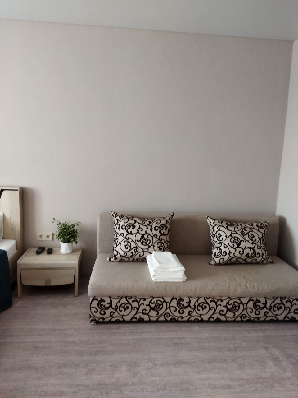 Внутри: двуспальная кровать с качественным матрасом, затемненные шторы, мягкий диван, балкон с зоной отдыха, стиральная машина, ванная комната с раковиной, туалетом и душем.