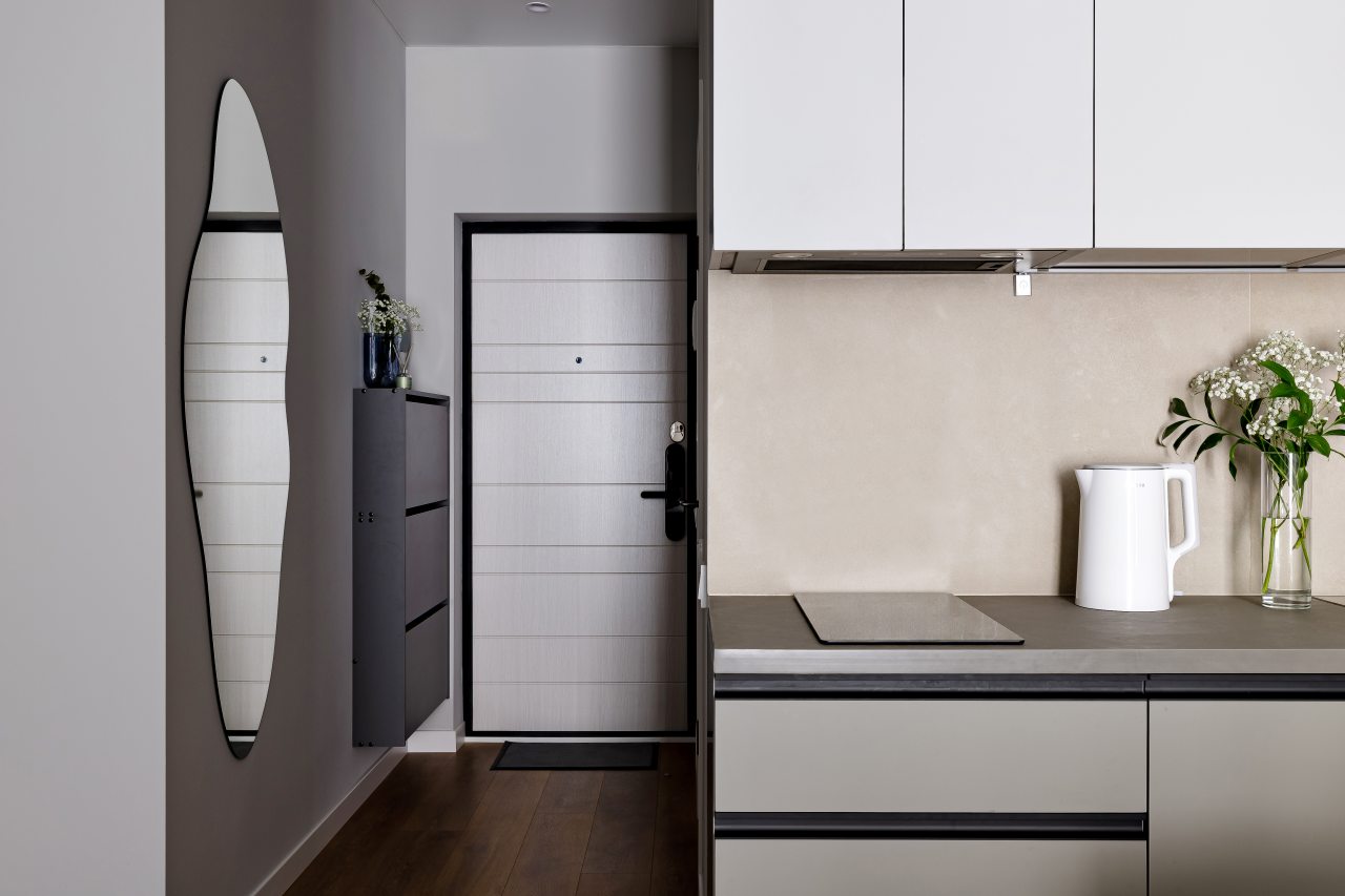 Кухонная зона оборудована комплектом стильного гарнитура, варочной панелью, вытяжкой, электрочайником, холодильником, микроволновой печью, духовым шкафом и обеденным столом.