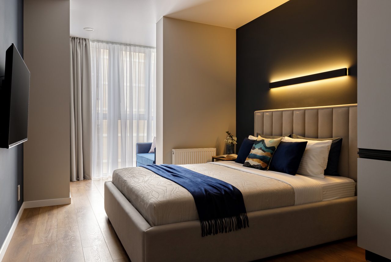 Уютные Апартаменты оснащены удобной двуспальной кроватью с чистым комплектом постельного белья, розетками возле спального места, затемненными шторами, телевизором, wi-fi и др. Санузел укомплектован качественной сантехникой, гигиеническими средствами и стиральной машиной.