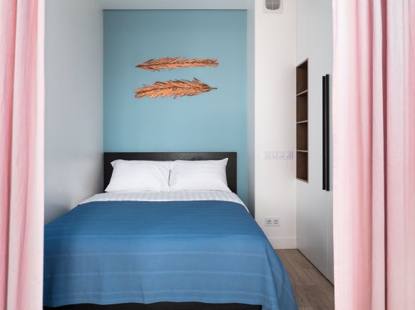 Внутри вас ожидает двуспальная кровать с мягким изголовьем, телевизор, кондиционер, мягкий диван, плотные шторы для качественного сна, туалетный столик, прикроватные светильники и розетки, шкаф с полноразмерным зеркалом, а также санузел со стиральной машиной.