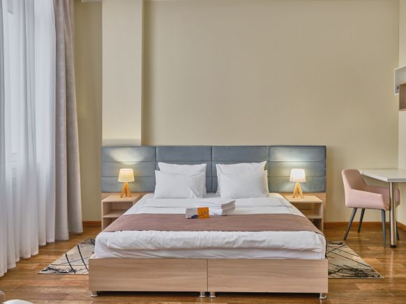 Проживали в отеле семьей во время путешествия. Отель очень хороший. Все новое и качественный ремонт. Понравилась кровать, очень удобная. Есть кухня со всеми удобствами. Хорошая посуда. Есть плита для приготовления блюд и холодильник для продуктов. Очень хорошая микроволновка и чайник. Диван раскладывается в удобную кровать. Хороший телевизор в зале и спальне. Шторы не пропускают свет. Напервом этаже есть кафе. Персонал очень вежливый и помогает во всем. У нас не работал вай фай. Позвонили на рецепшен и нам подсказали как все запустить. Очень советую данный отель всем путешественникам. Все продумано до мелачей. Лучше чем дома. Высокие потолки в номере придают обьем и не давят на человека. Удобные кресла и диван. Есть халат и тапочки. На кухне предложены чай, кофе и вода. Есть сахар. Соль. Перец. Огромные окна. Свет продуман хорошо. Шифонеры высокие. Зеркала удобные. Ванная комната большая. Хорошая сан. техника. Мыло, шампунь и гель для душа. Бритвенный набор и расчестка. В номере тихо и спокойно. Можно хорошо отдохнуть. Рядом магазин Пятерочка. Хорошее расположение. Лифты быстрые и бесшумные. Замечательные замки электронные. В холле панно. Светильники везде работают. Лампочки хорошо светят. Много розеток и фен. Телевизоры хорошо ловят все программы. Теплые одеяла и удобные подушки. Замечательные халаты и тапочки. Полотенца белоснежные. Простыни чистейшие. Хорошее мыло. Шампунь и гель для душа. Есть шапочки и мыло. Бритвенный набор и гель для бритья. Самый лучший отель. Самый современный и самый новый. Много где останавливались, но этототель самый лучший. Все очень понравилось. Обязательно вернемся и посоветуем всем сюда приезжать. Не пожалеете. Приезжайте в этот отель для качественного отдыха и сна. Все создано, чтобы хорошо выспаться и набраться сил для дальнейшего путешествия.