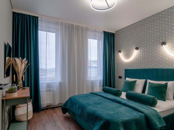 Когда были в Красноярске, расположились в апартаментах Home Day. Квартиру брали в ЖК Отражение в 36-м доме. Очень нам понравился интерьер, выбранная стилистика в оформлении. Шторы здесь плотные на окнах. Большие фотообои на стенах, которые приковывают внимание и смотрятся очень стильно. Мебели как основной, так и дополнительной в виде пуфика, тумбочек, здесь предостаточно. Во дворе есть хорошая детская площадка. Лестничные пролеты в подъезде большие, с соседями не сталкивались. И кстати никого не слышали, звукоизоляция действительно хорошая.
