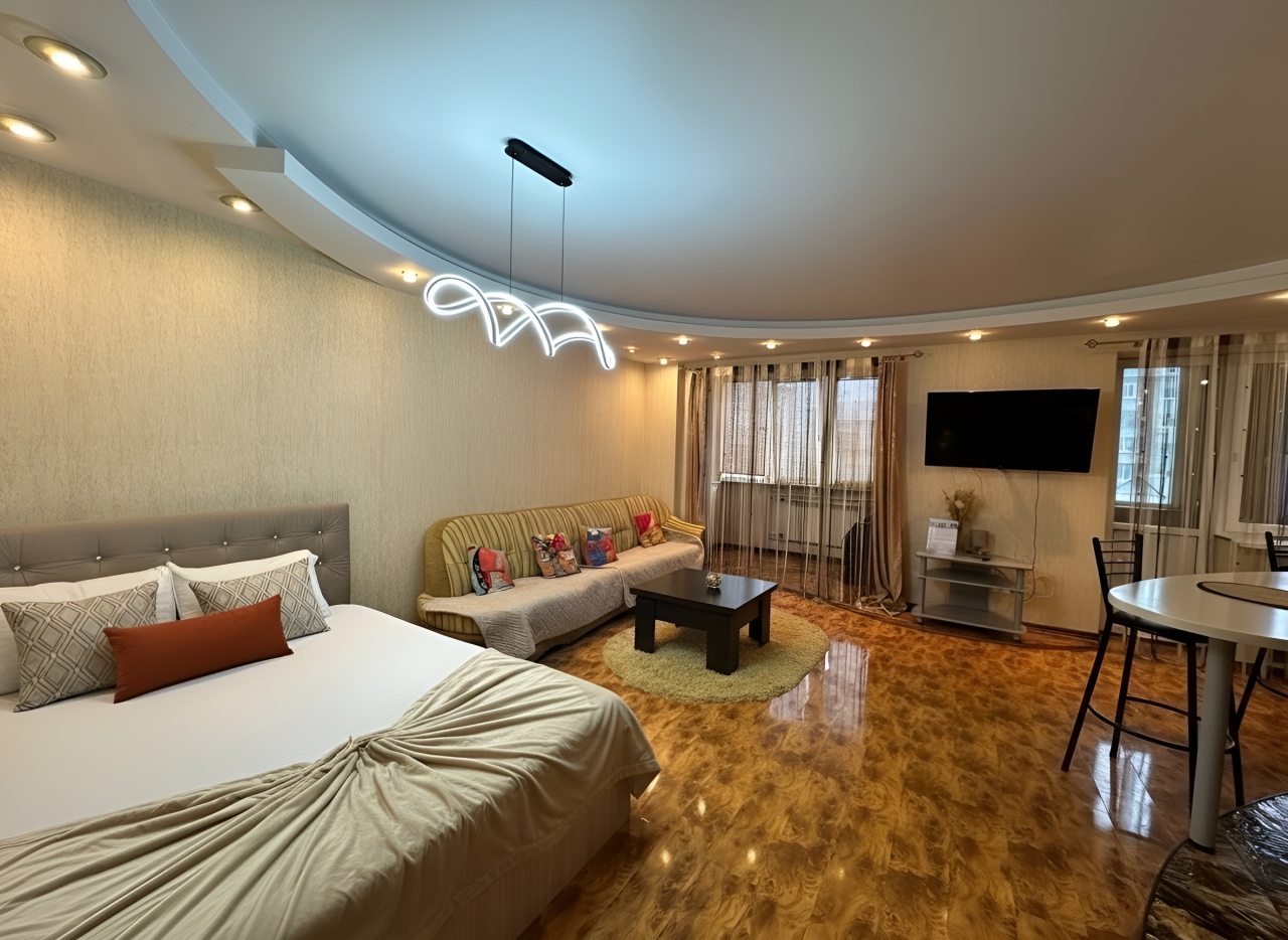 Студия сразу привлекает современным интерьером и необычной деталью в виде джакузи. Атмосфера располагает к романтическому отдыху и расслаблению. Пространство гармонично, чувствуется продуманность в оформлении. Вечером можно устроить настоящий отдых без лишних хлопот. Чистота и порядок поддерживаются на хорошем уровне. Всё выглядит свежо и уютно.