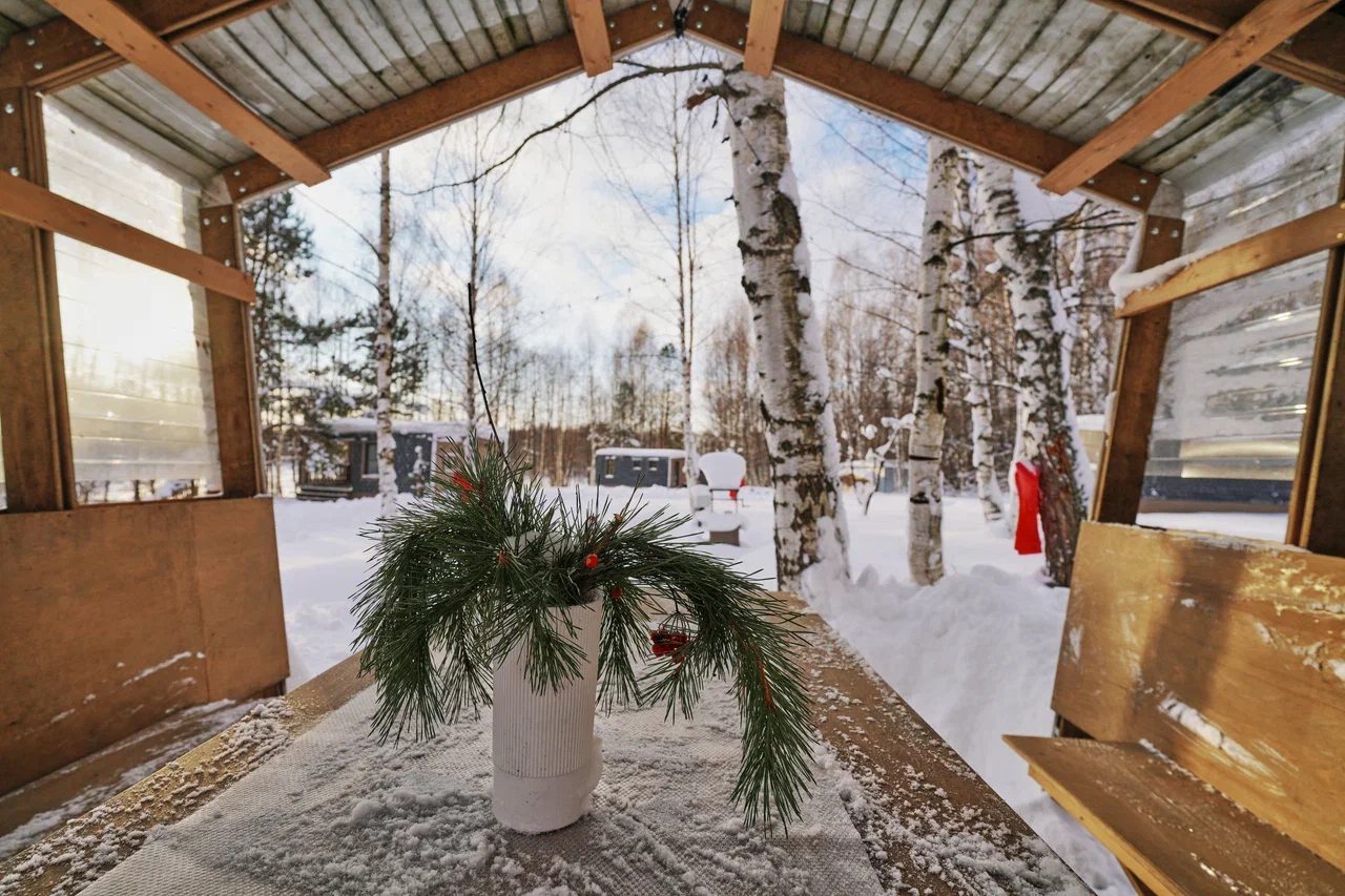 На небольшой кухонной зоне есть необходимая бытовая техника и принадлежности для самостоятельного приготовления и разогревания еды. Также для удобства гостей предусмотрена оборудованная мангальная зона.