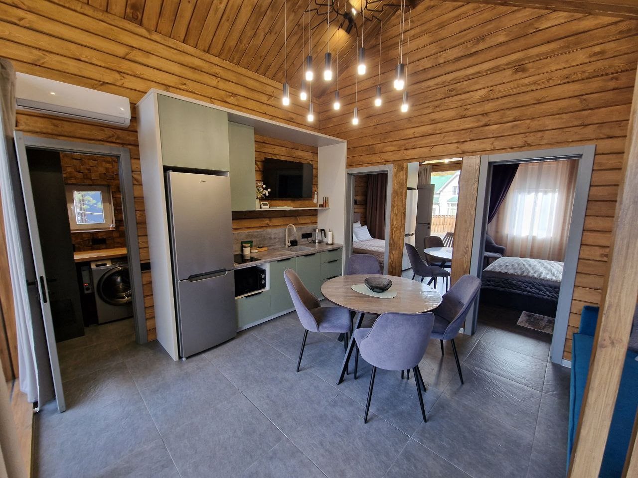 Гости могут разместиться в уютных дизайнерских домах с двумя отдельными спальнями, которые оснащены Яндекс станцией Алиса, Wi-Fi, смарт-ТВ, кондиционером, посудомоечная машиной. Санузел укомплектован современной сантехникой, стиральной машиной.