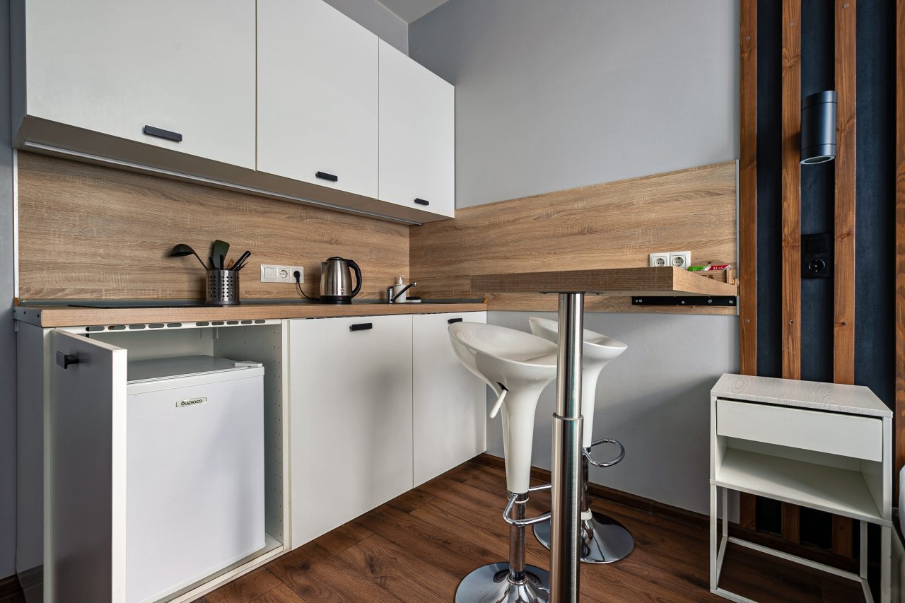 Кухня укомплектована гарнитуром, холодильником, чайником, варочной панелью и набором посуды. В шаговой доступности продуктовые магазины.
