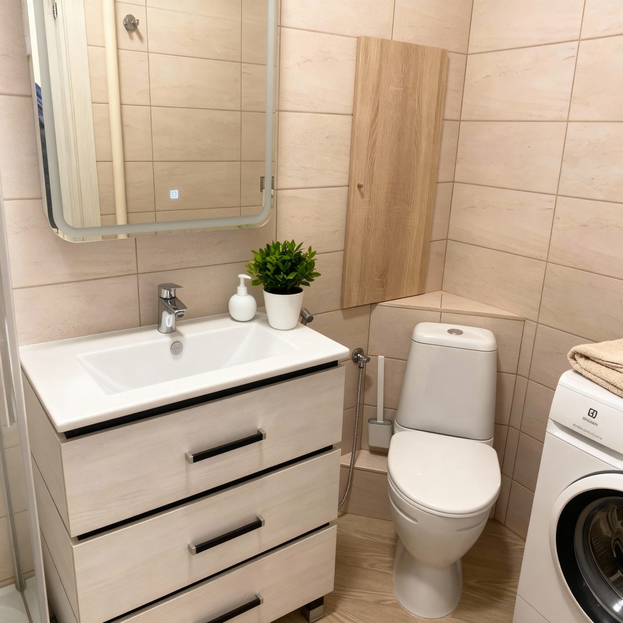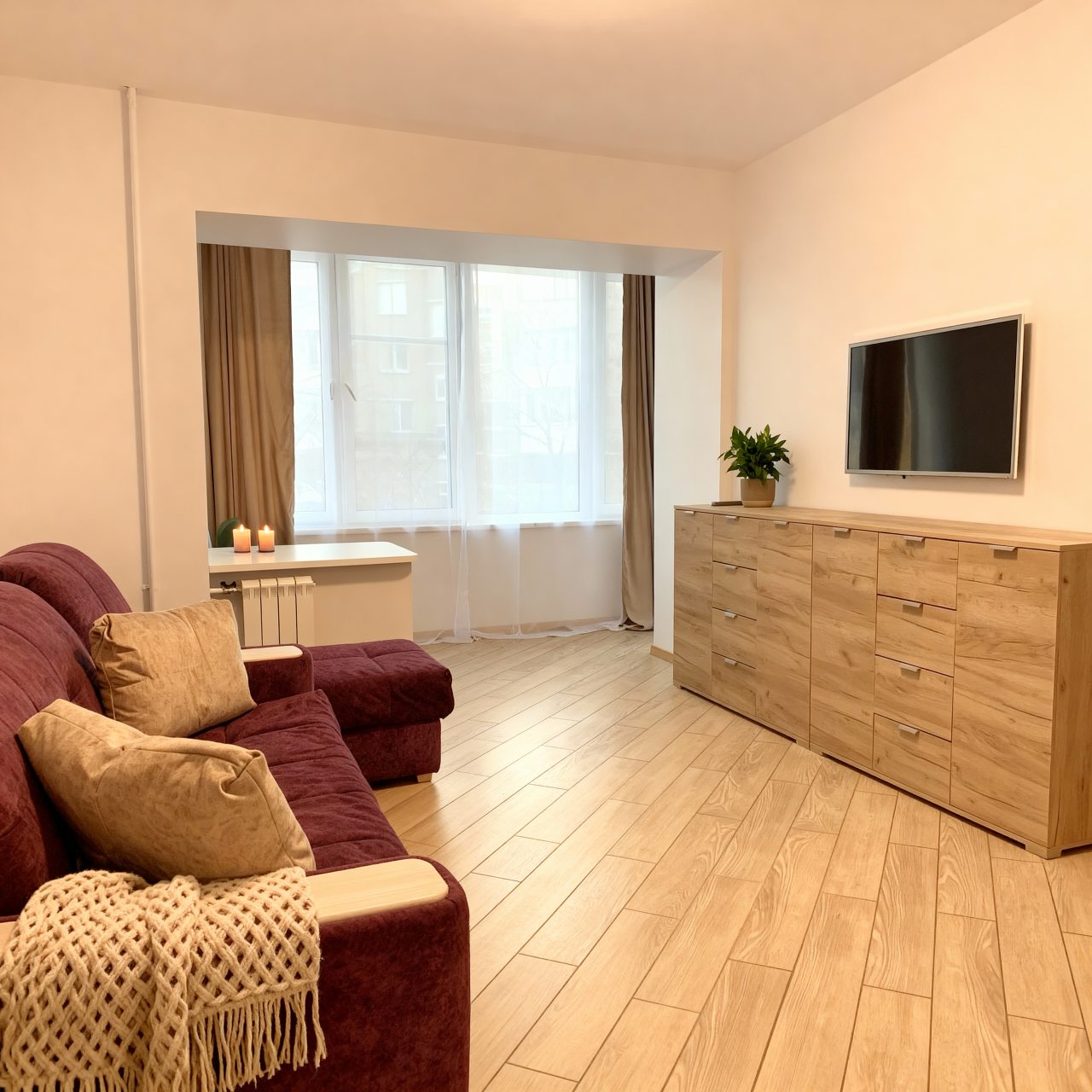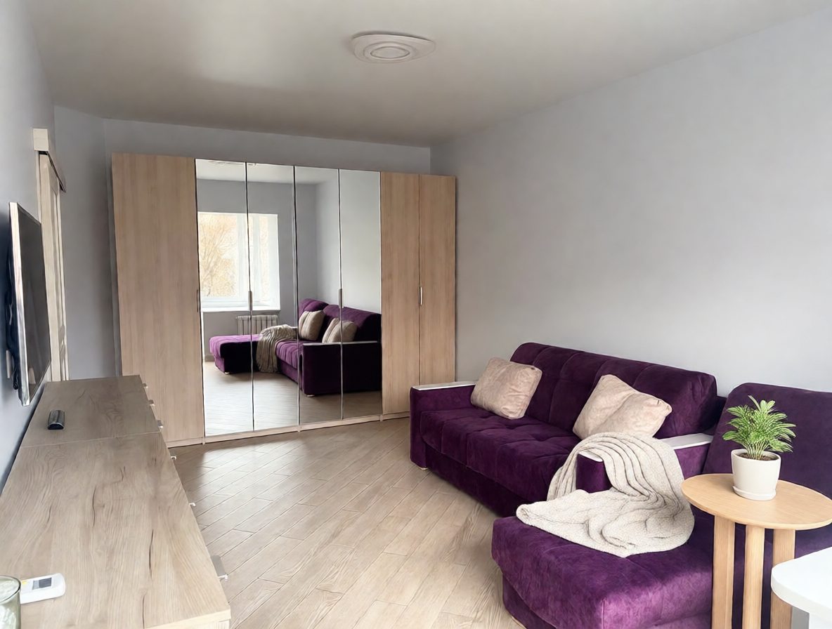 Внутри вас ожидает удобный раскладной диван, телевизор, вместительный шкаф с зеркалом, комод, санузел со стиральной машиной и необходимой сантехникой, просторная лоджия.