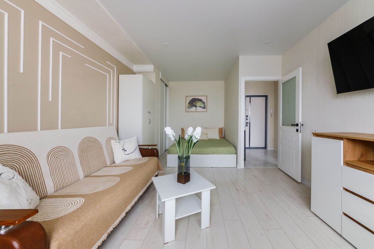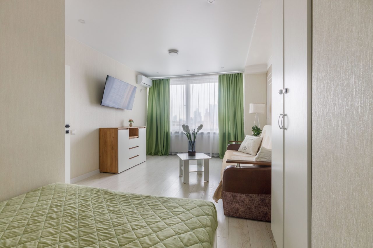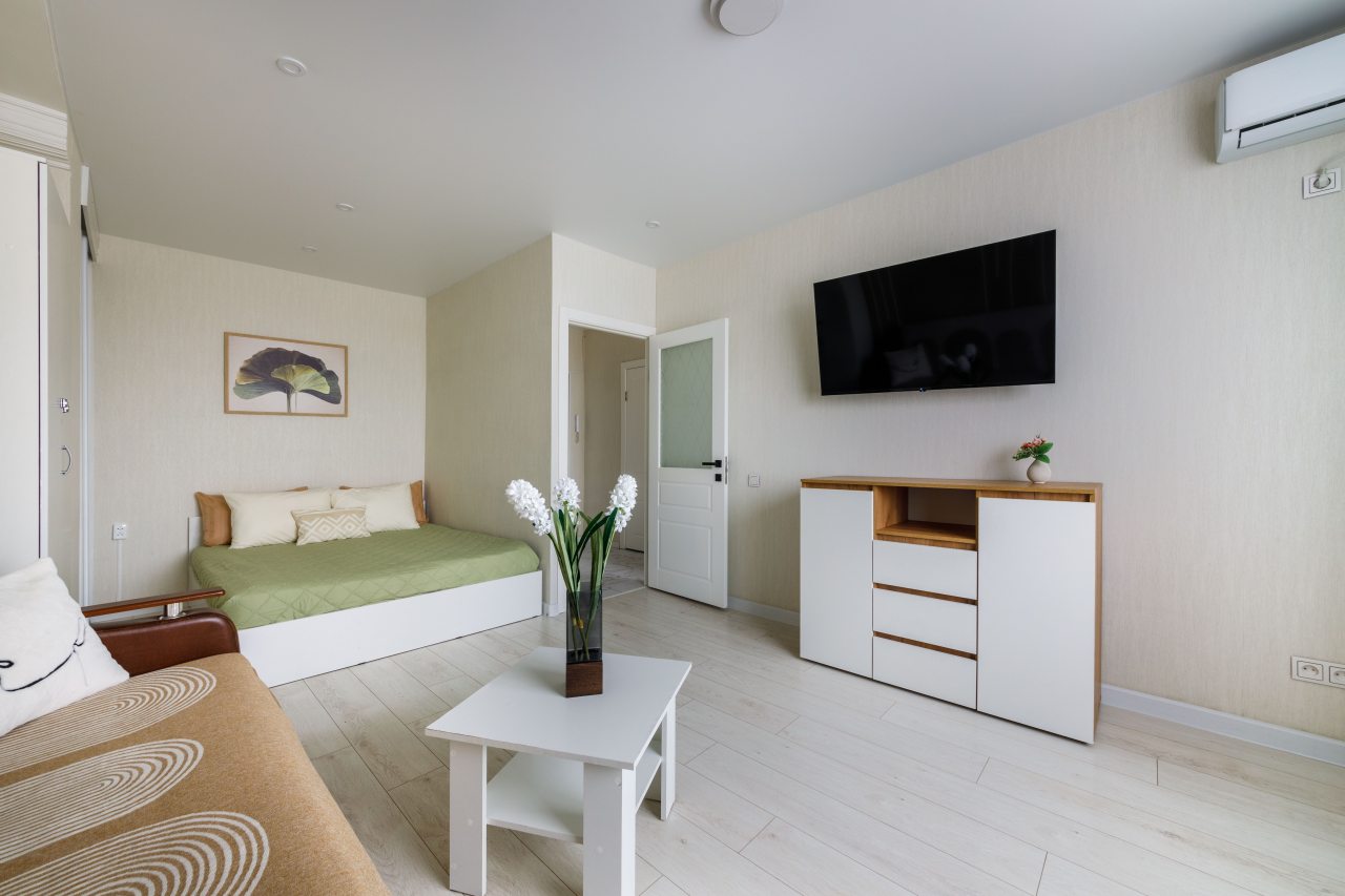 Светлая квартира укомплектована всем для комфортабельного проживания. Она имеет удобную двуспальную кровать, шкаф и шкаф-купе для хранения личных вещей, кондиционер для регулирования температуры в помещении. Для досуга гостей в апартаментах оборудована точка высокоскоростного интернета и телевизор со спутниковым телевидением. Санузел оснащен всей нужной сантехникой, феном и гигиеническими средствами.