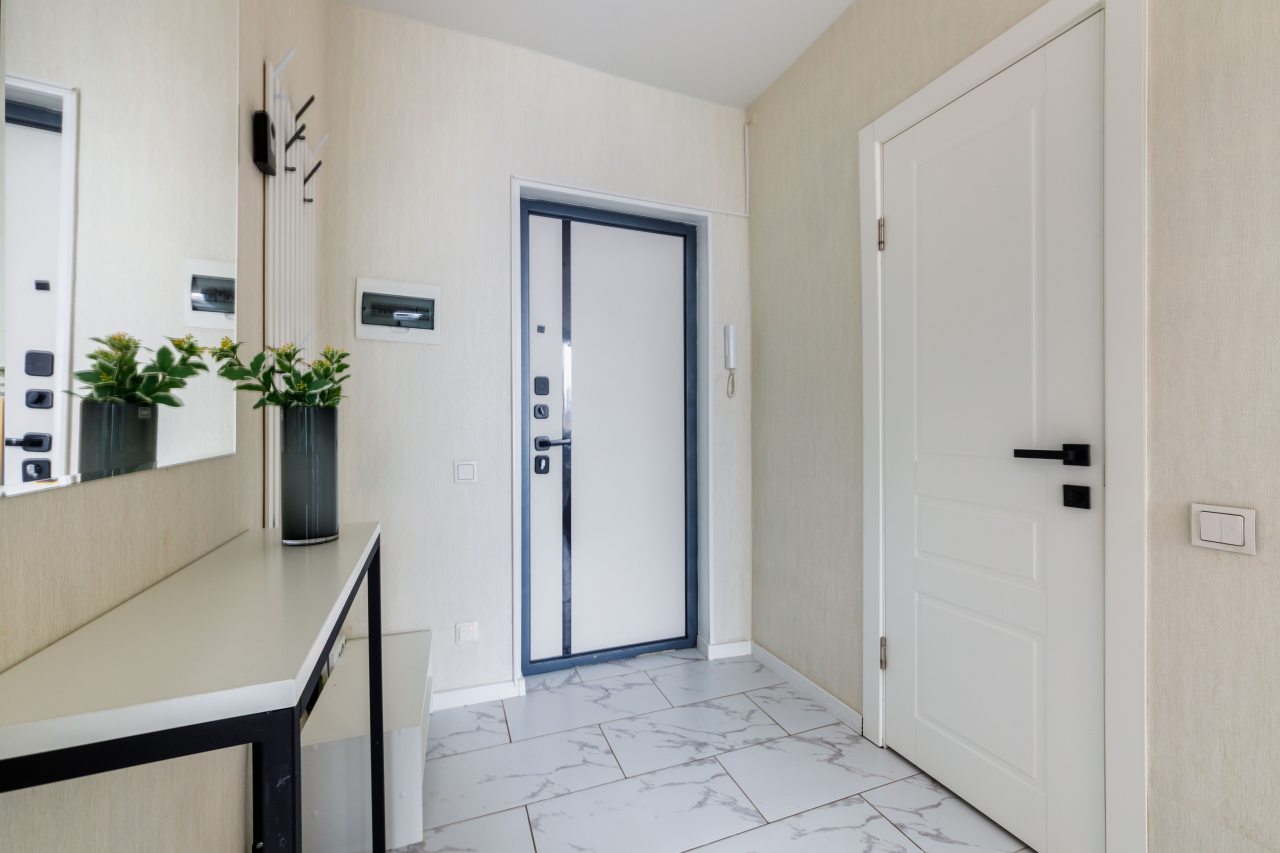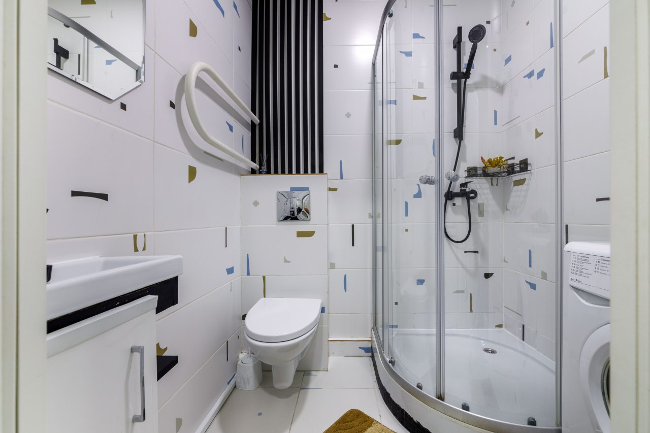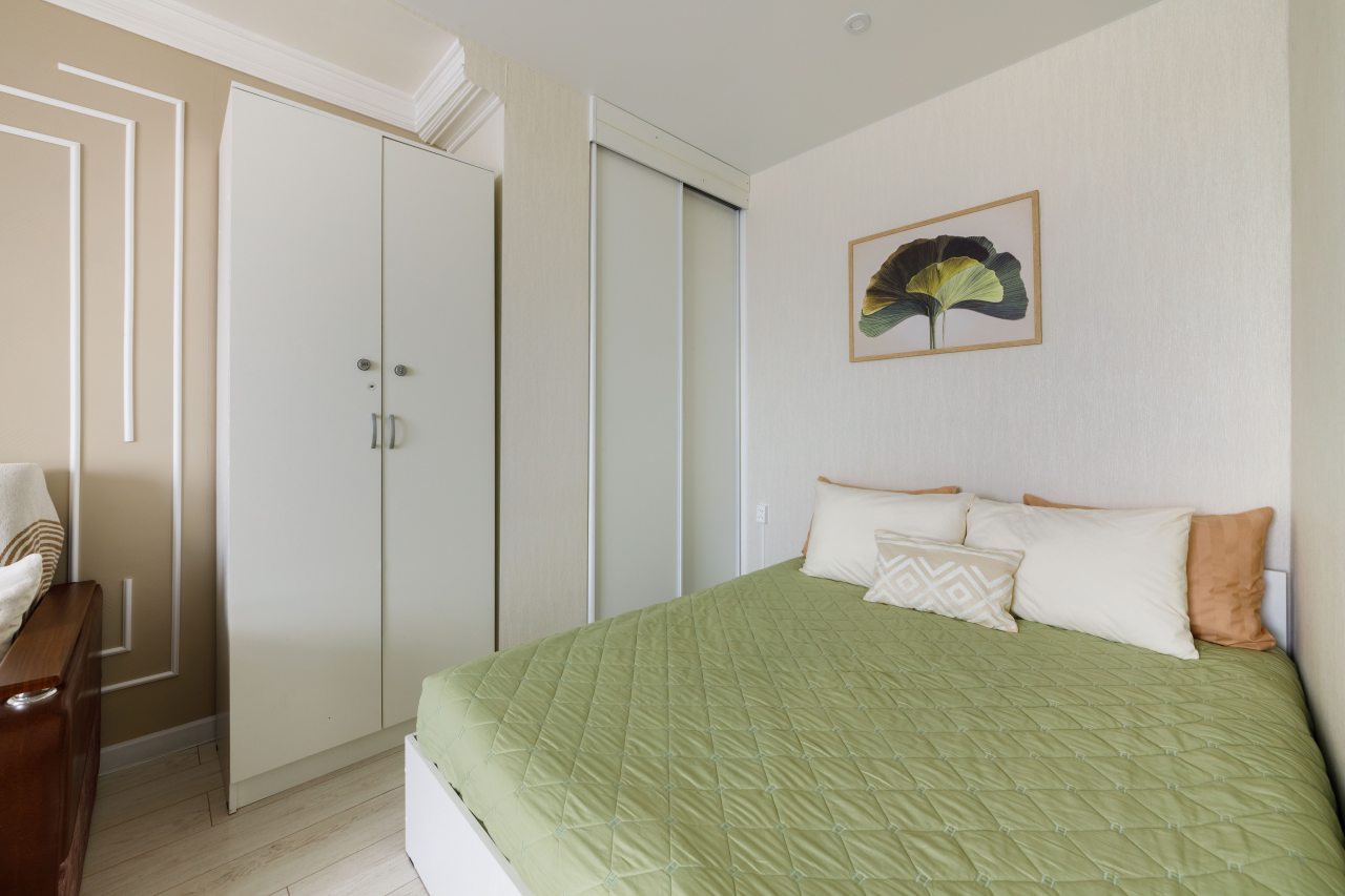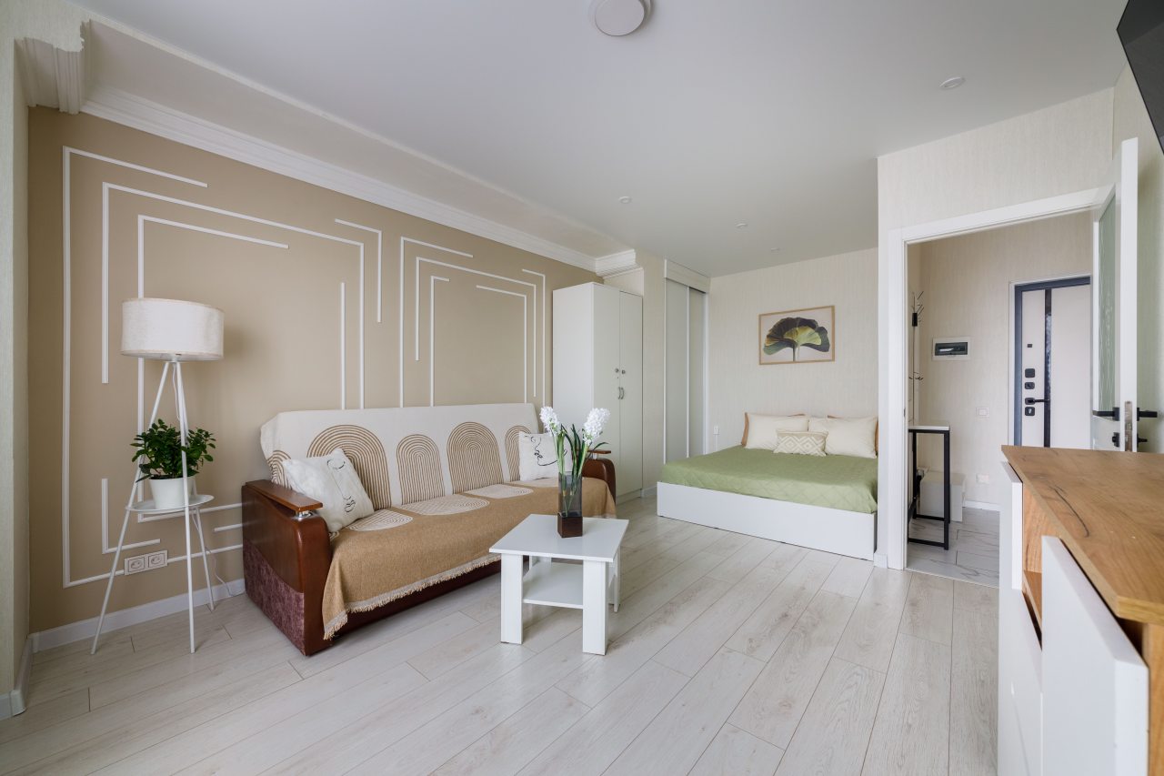 Светлая квартира укомплектована всем для комфортабельного проживания. Она имеет удобную двуспальную кровать, шкаф и шкаф-купе для хранения личных вещей, кондиционер для регулирования температуры в помещении. Для досуга гостей в апартаментах оборудована точка высокоскоростного интернета и телевизор со спутниковым телевидением. Санузел оснащен всей нужной сантехникой, феном и гигиеническими средствами.