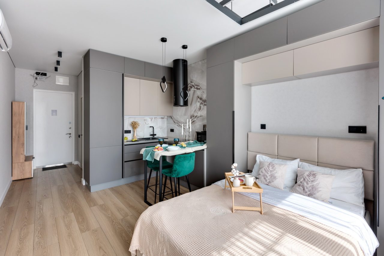 Комплектация кухонной бытовой техники может варьироваться. В каждых предусмотрены варочная панель с вытяжкой, чайник, холодильник, СВЧ, уютная обеденная зона.
