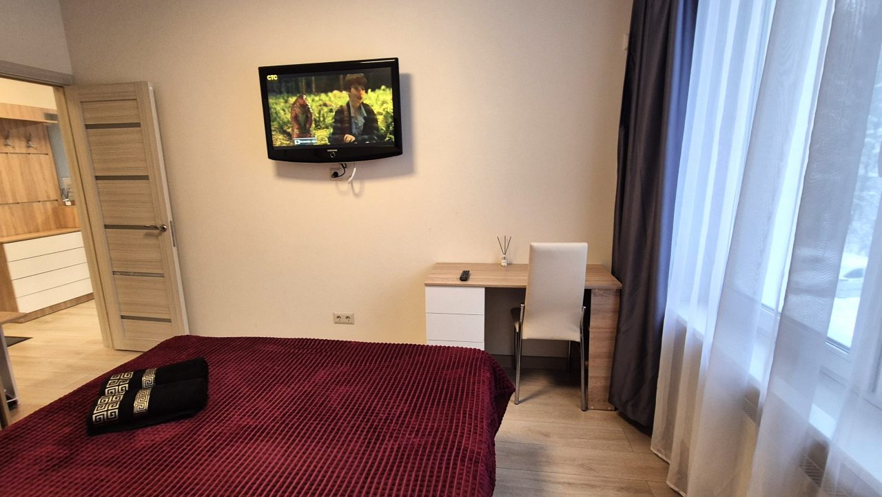 Уютные апартаменты оборудованы удобной двуспальной кроватью, шкафом, письменным столом, телевизором, кондиционером, диваном, балконом. Санузел укомплектован современной сантехникой, гигиеническими средствами, полотенцесушителем, стиральной машиной. Доступна точка высокоскоростного интернета.