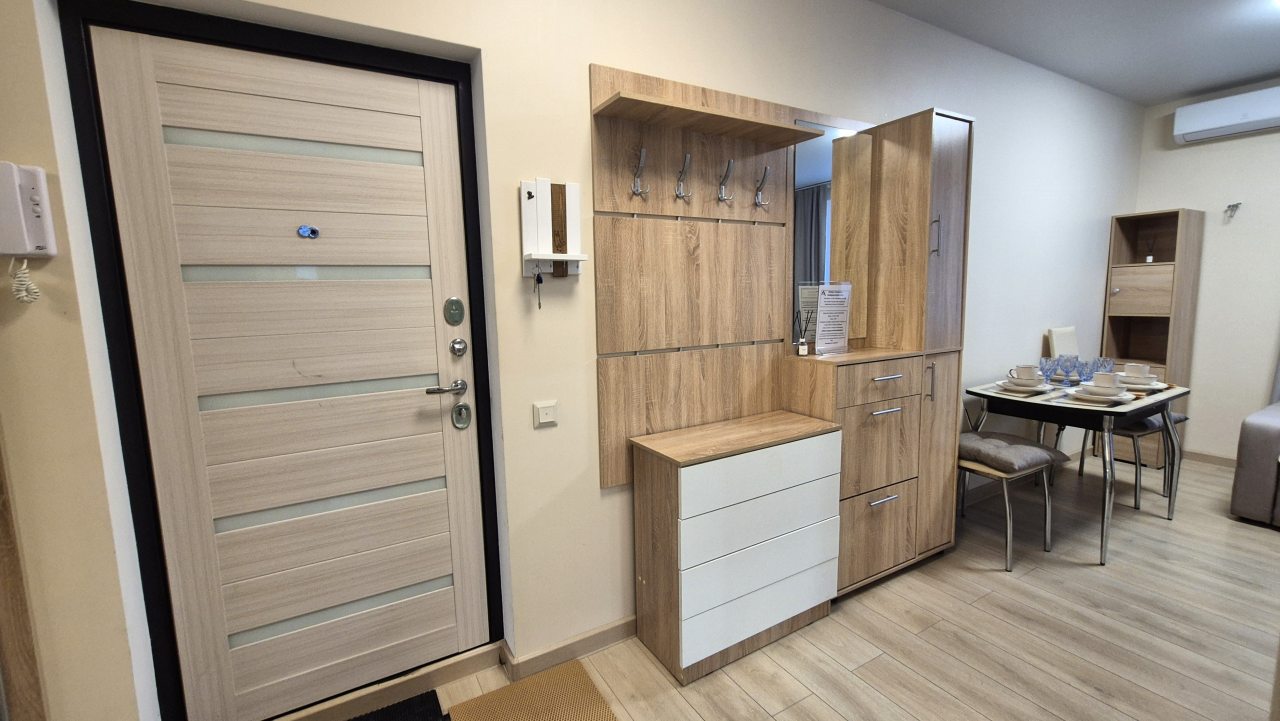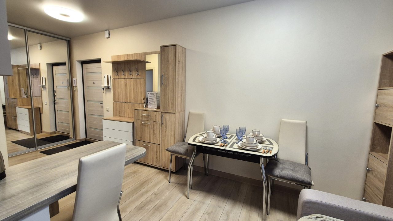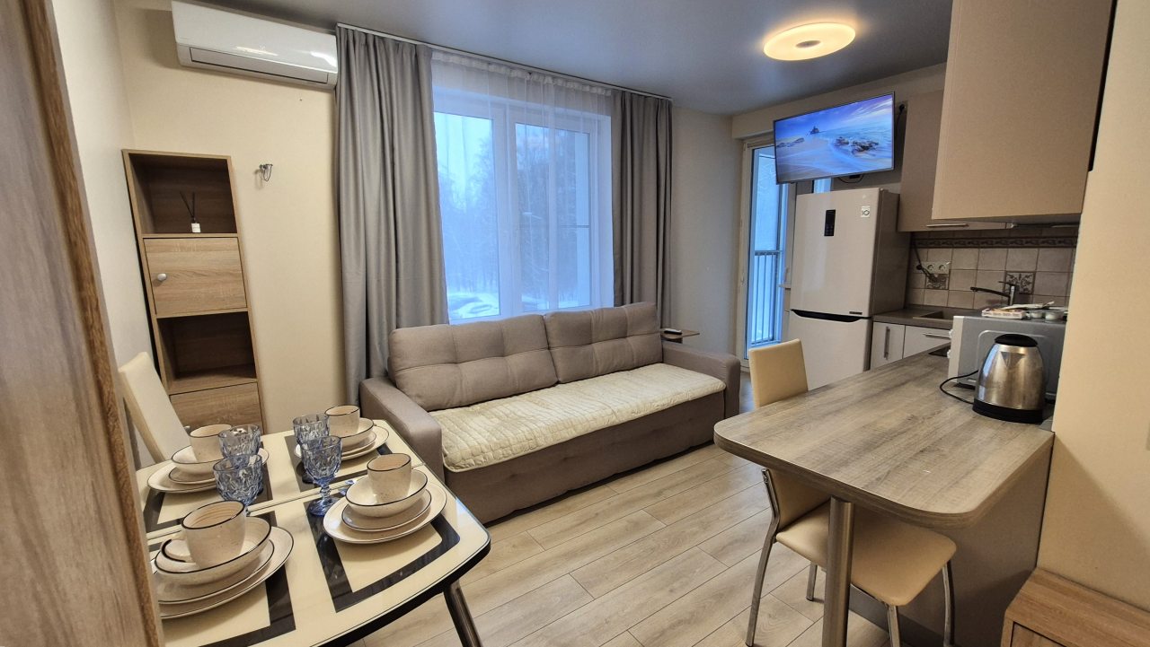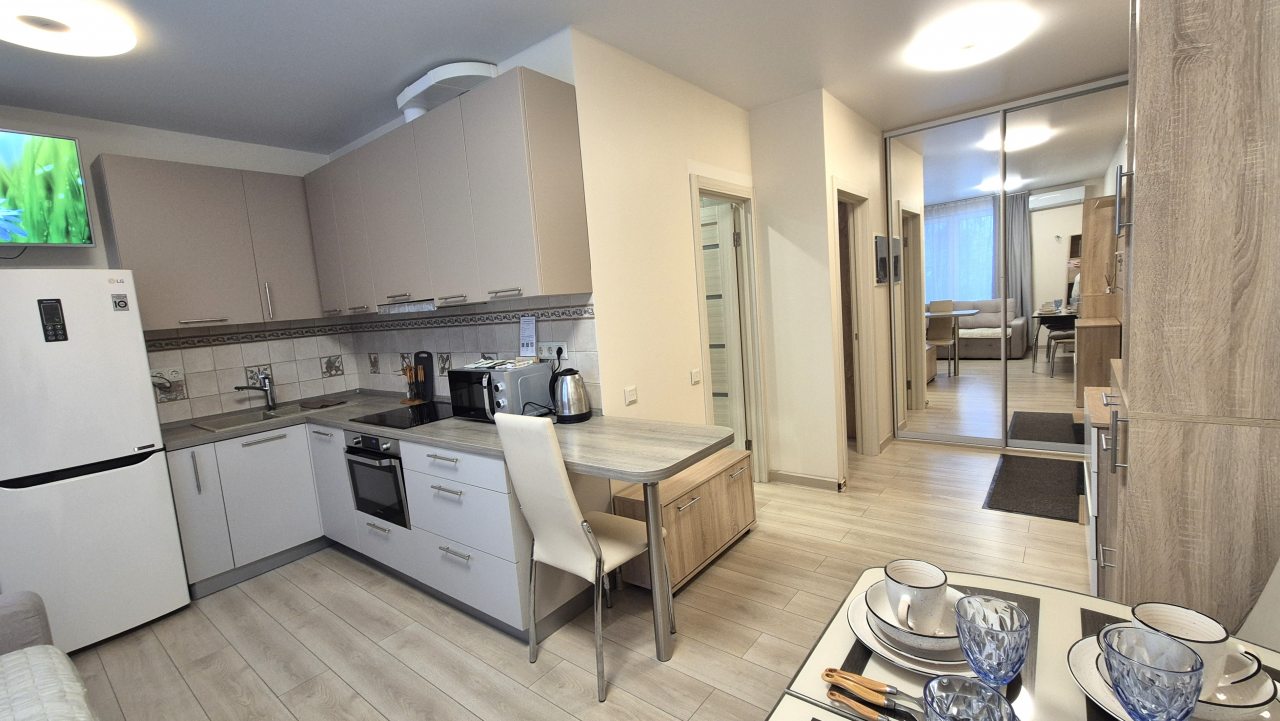 Кухонная зона оснащена стильным гарнитуром, духовым шкафом, вытяжкой, холодильником, варочной панелью, электрочайником. Пообедать можно в ближайшем кафе.