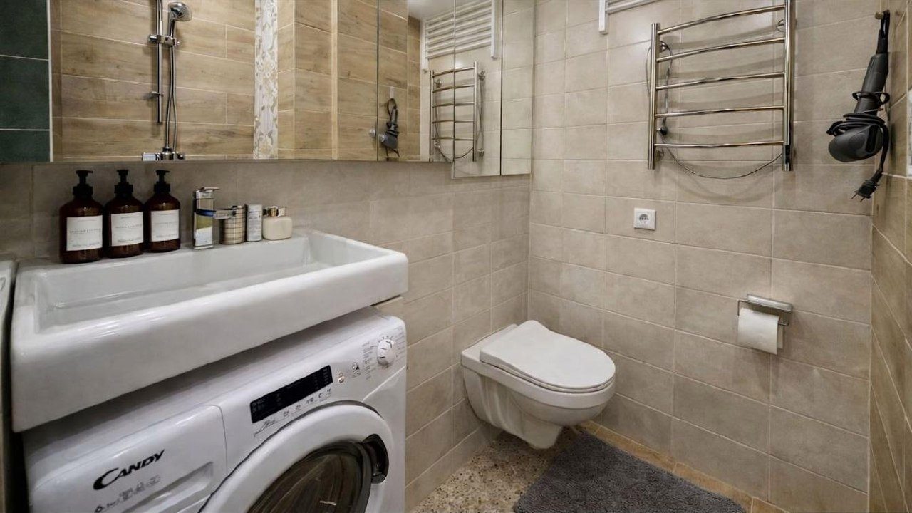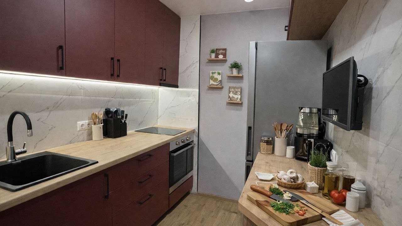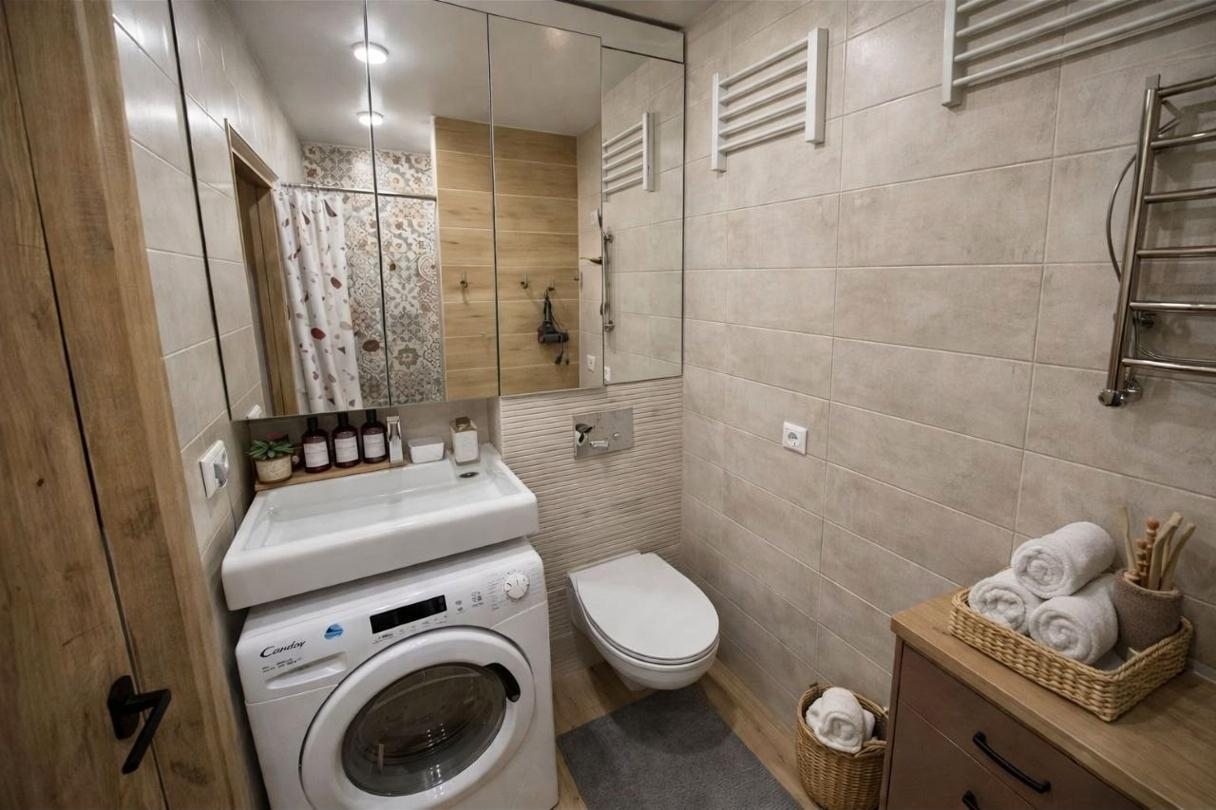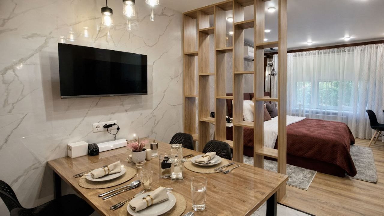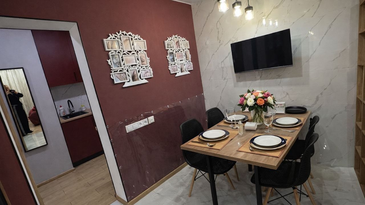 Комплектация кухонной бытовой техники может отличаться. В каждых апартаментах в наличии чайник, СВЧ, холодильник, обеденная зона.