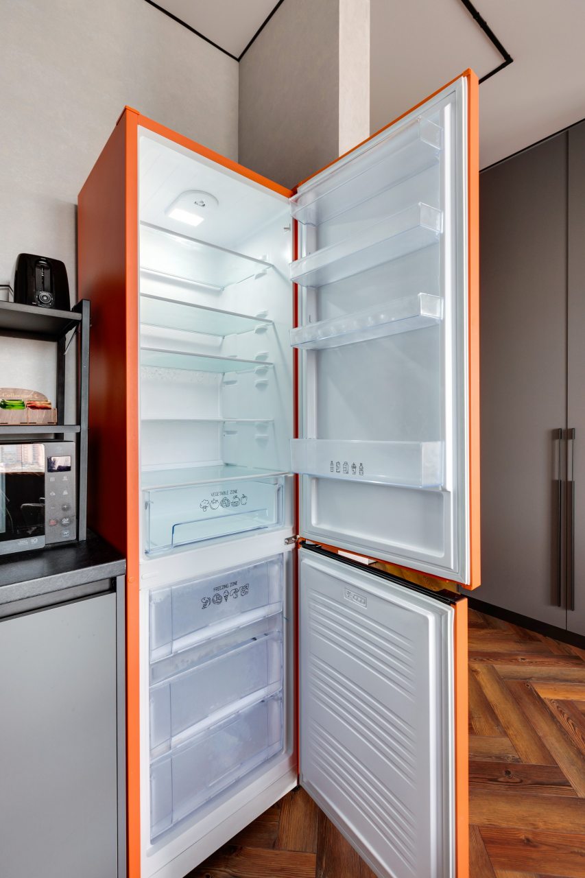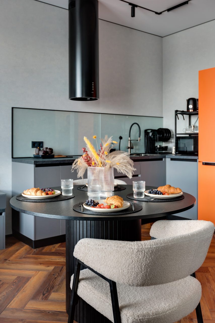 Зона кухни оснащена варочной панелью с вытяжкой, СВЧ, чайником, тостером, посудой, ярким холодильником, красивым обеденным столом и стульями.